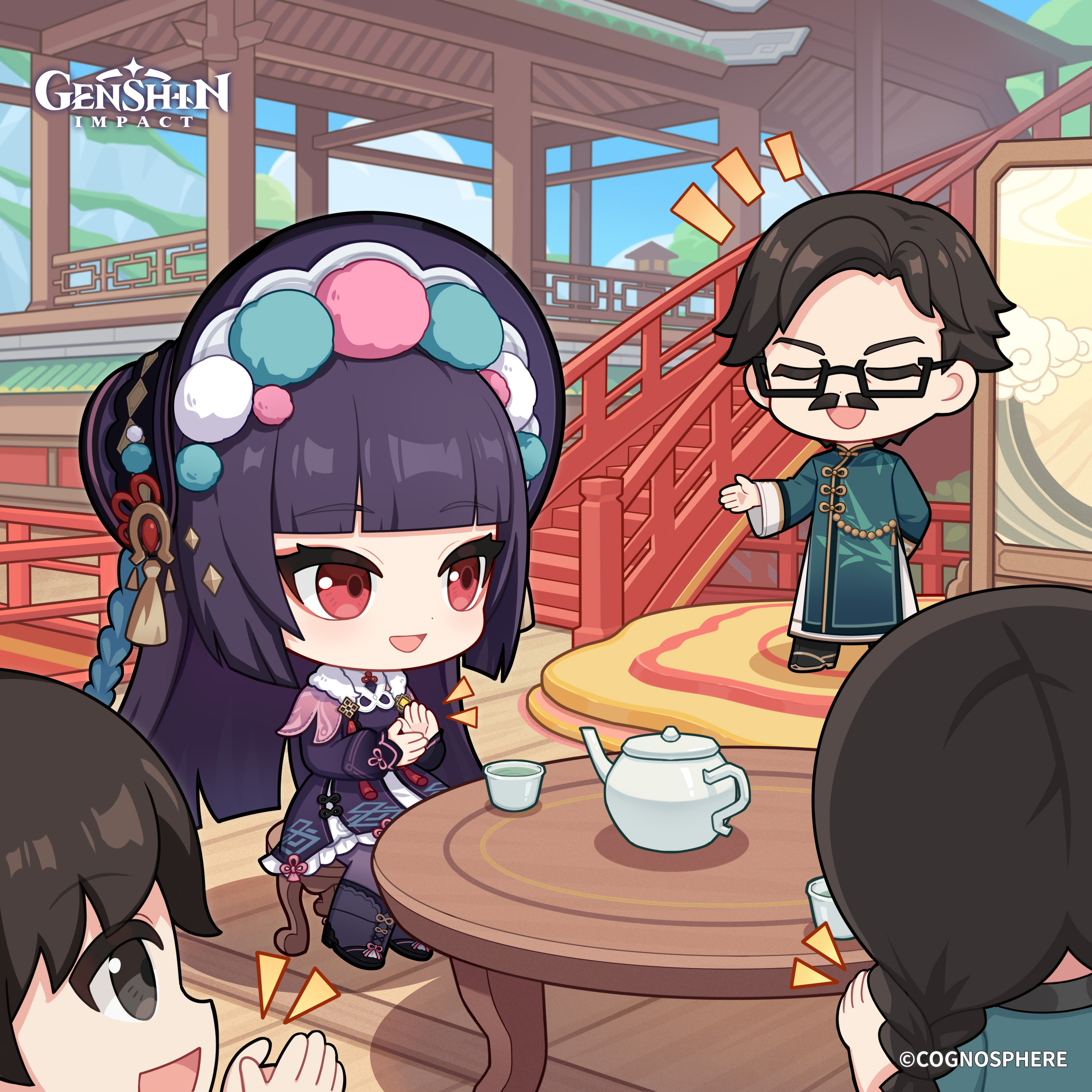 2boys 2girls absurdres blunt_bangs blunt_ends bonnet boots braid chair chibi chinese_clothes commentary copyright_name cup day dot_nose dress english_commentary facial_hair genshin_impact glasses hair_ornament highres long_sleeves multiple_boys multiple_girls mustache official_art on_chair open_mouth puffy_long_sleeves puffy_sleeves purple_dress purple_hair red_eyes sitting stairs table tassel teacup teapot yun_jin_(genshin_impact)