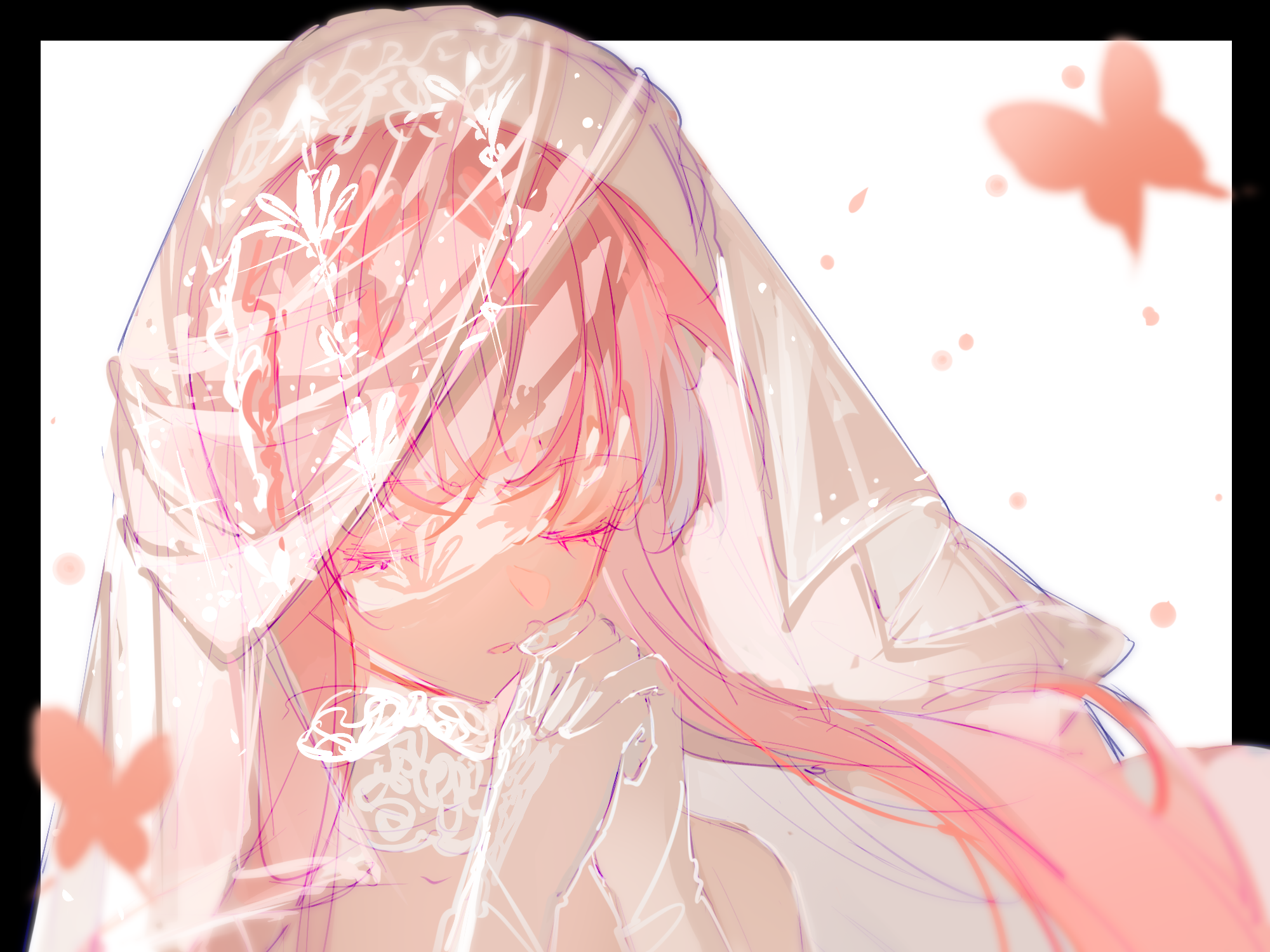 1girl bare_shoulders black_border border bug butterfly chinese_commentary closed_eyes collar commentary_request detached_collar floating_hair gloves highres insect interlocked_fingers lace_collar long_hair nikki_(nikki) nikki_(series) outside_border own_hands_together petals pink_butterfly pink_hair praying see-through_clothes see-through_veil shining_nikki simple_background solo upper_body veil very_long_hair white_background white_collar white_gloves white_veil yameibuyichuanglianliujuanhua