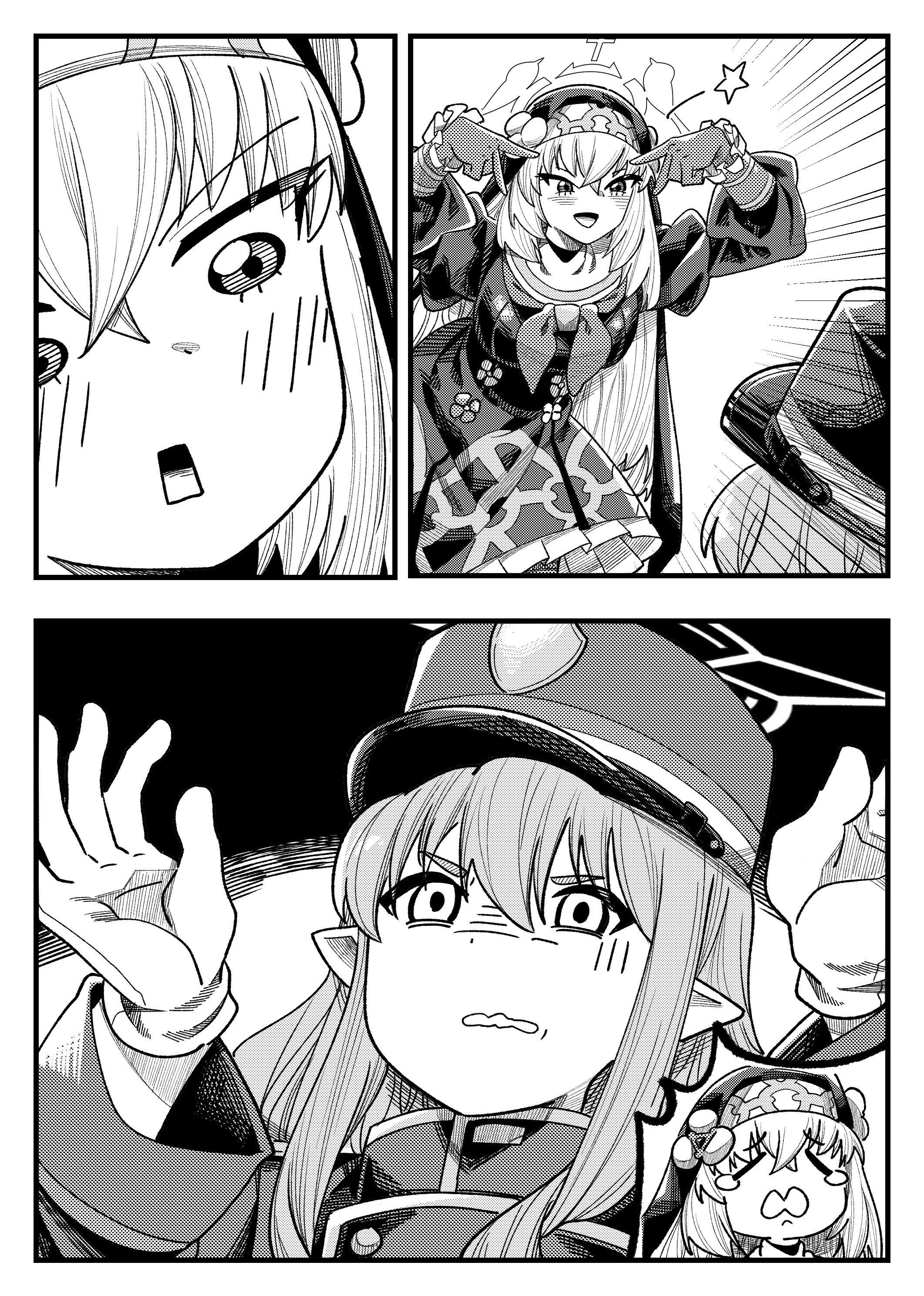 2girls absurdres blue_archive blush charmbird closed_eyes crossed_bangs crying double_v dress gloves greyscale hat highres hikari_(blue_archive) long_hair monochrome multiple_girls neckerchief open_mouth peaked_cap pointy_ears sakurako_(blue_archive) sidelocks v veil