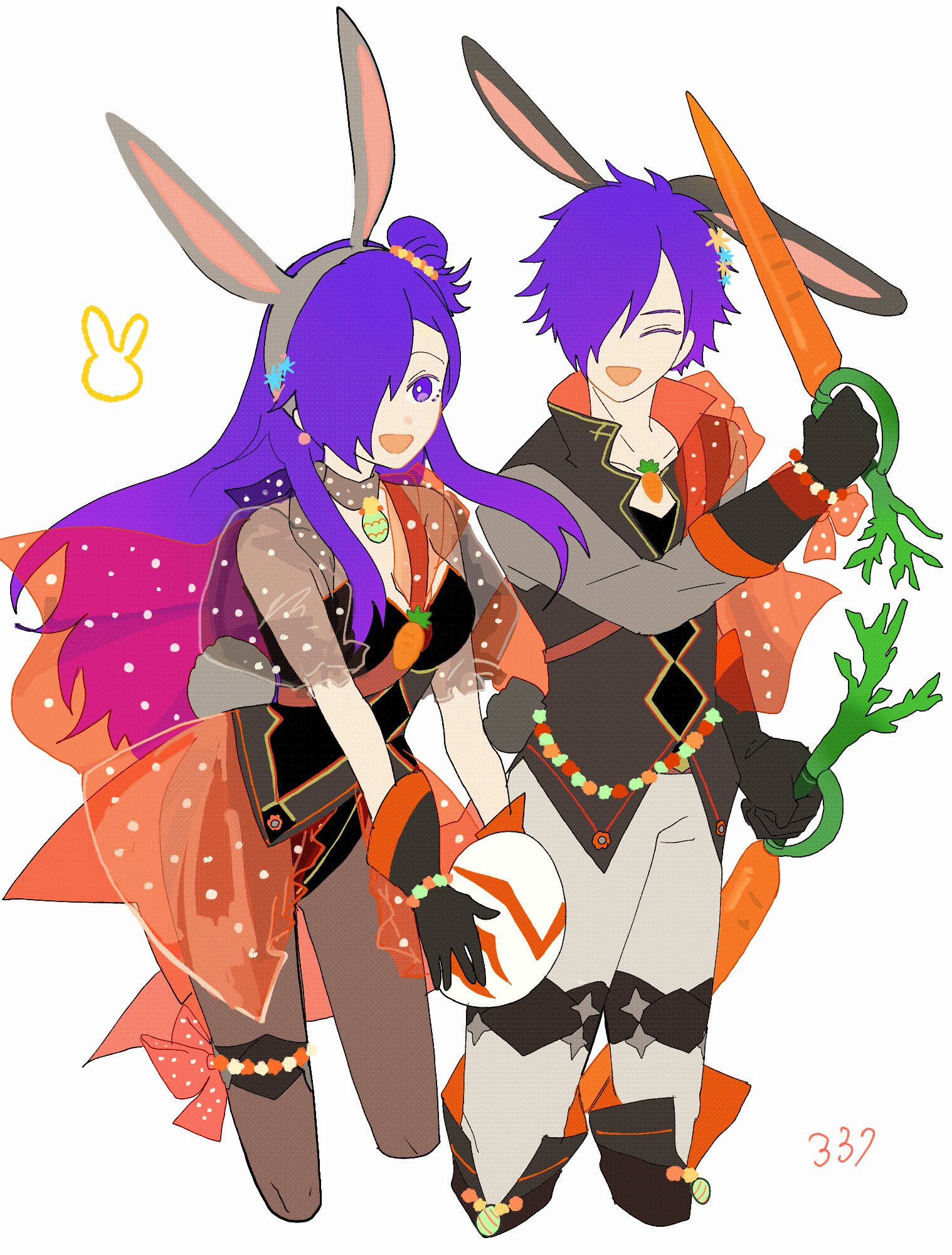 1boy 1girl :d alternate_costume animal_ear_hairband animal_ears arm_up black_choker black_gloves black_leotard black_vest bow bracelet breasts brown_pantyhose carrot choker cleavage closed_eyes coattails collarbone cropped_legs earrings easter easter_egg egg fake_animal_ears female_shez_(fire_emblem) fire_emblem fire_emblem:_three_houses fire_emblem_heroes fire_emblem_warriors:_three_hopes flower gloves grey_pants grey_shirt hair_bun hair_flower hair_ornament hair_over_one_eye hairband highres holding holding_egg holding_weapon jewelry leotard long_hair looking_at_viewer male_shez_(fire_emblem) medium_breasts nintendo no_nose one_eye_covered one_side_up open_mouth orange_bow pants pantyhose polka_dot polka_dot_skirt polka_dot_sleeves puffy_short_sleeves puffy_sleeves purple_hair rabbit_ears rabbit_tail see-through_clothes see-through_skirt see-through_sleeves shirt short_hair short_sleeves single_hair_bun skirt smile tail tailcoat thigh_bow thighlet very_long_hair vest weapon