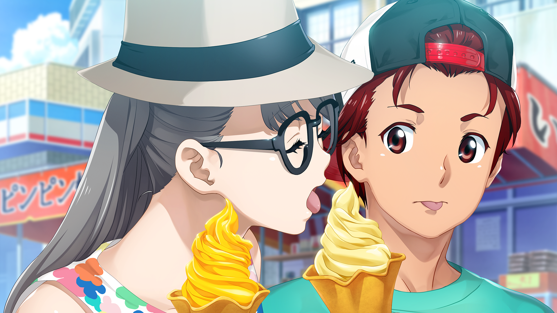 1boy 1girl arm_hug beret black-framed_eyewear blue_eyes blurry blurry_background closed_eyes collarbone dress eyelashes fedora food fukuda_tomonori game_cg glasses grey_hair hair_between_eyes hat highres holding holding_food holding_ice_cream ice_cream ice_cream_cone licking long_hair looking_at_another official_art open_mouth red_eyes red_hair robotics;notes robotics;notes_dash science_adventure shiny_eyes shiny_skin shirt short_hair sundress sunlight swept_bangs t-shirt tongue tongue_out watch white_dress white_hat white_shirt wristwatch yashio_kaito yukifune_airi