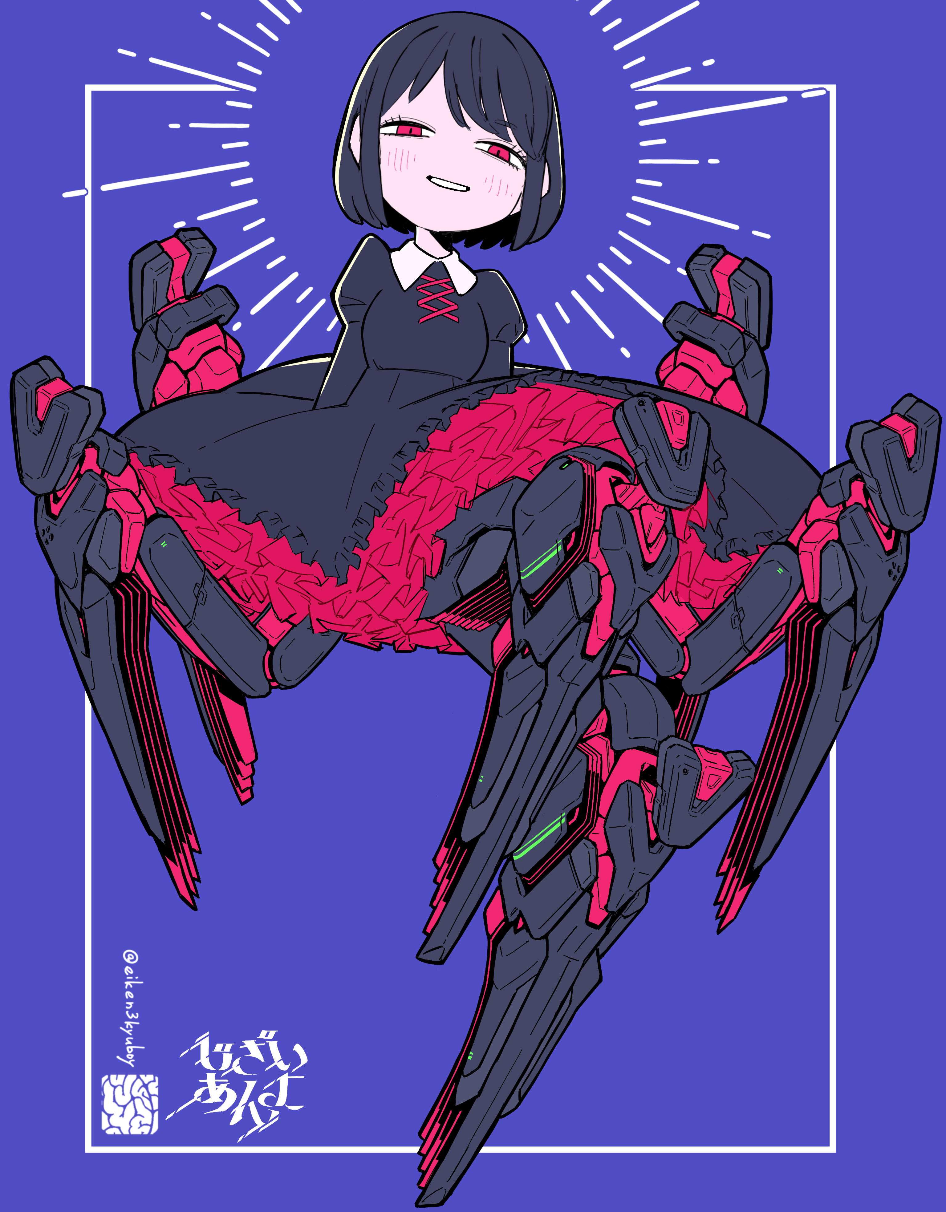 1girl absurdres arthropod_limbs black_dress black_hair blue_background dress extra_legs frilled_dress frills highres iwako_(eiken3kyuboy) looking_at_viewer mechanical_legs original red_eyes short_hair smile solo