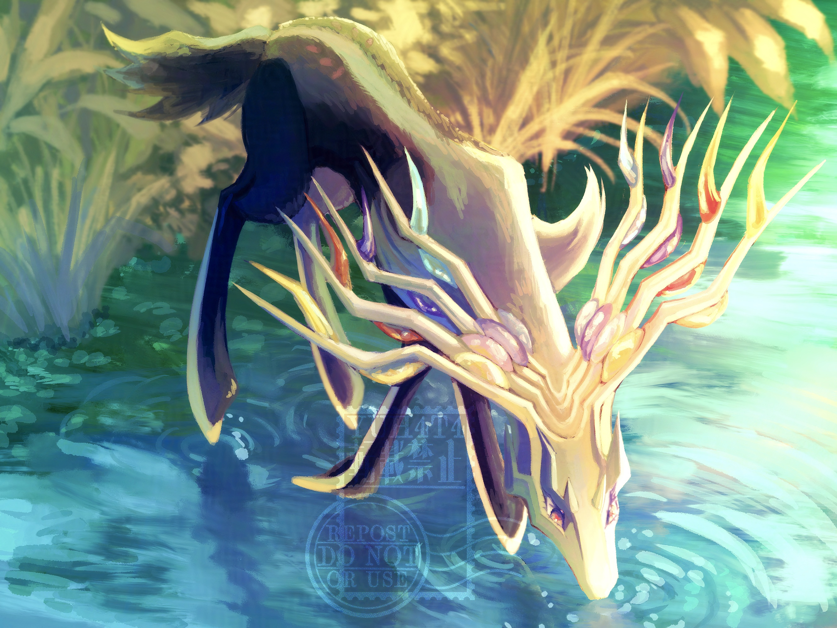 animal_focus artist_name blue_eyes blue_gem blurry blurry_background bush day drinking full_body gem gen_6_pokemon highres leaning_forward legendary_pokemon looking_down nintendo no_humans outdoors pokemon pokemon_(creature) purple_gem red_gem red_pupils ripples river solo standing standing_on_liquid water watermark xerneas yellow_gem yuhata_(yuh4t4)