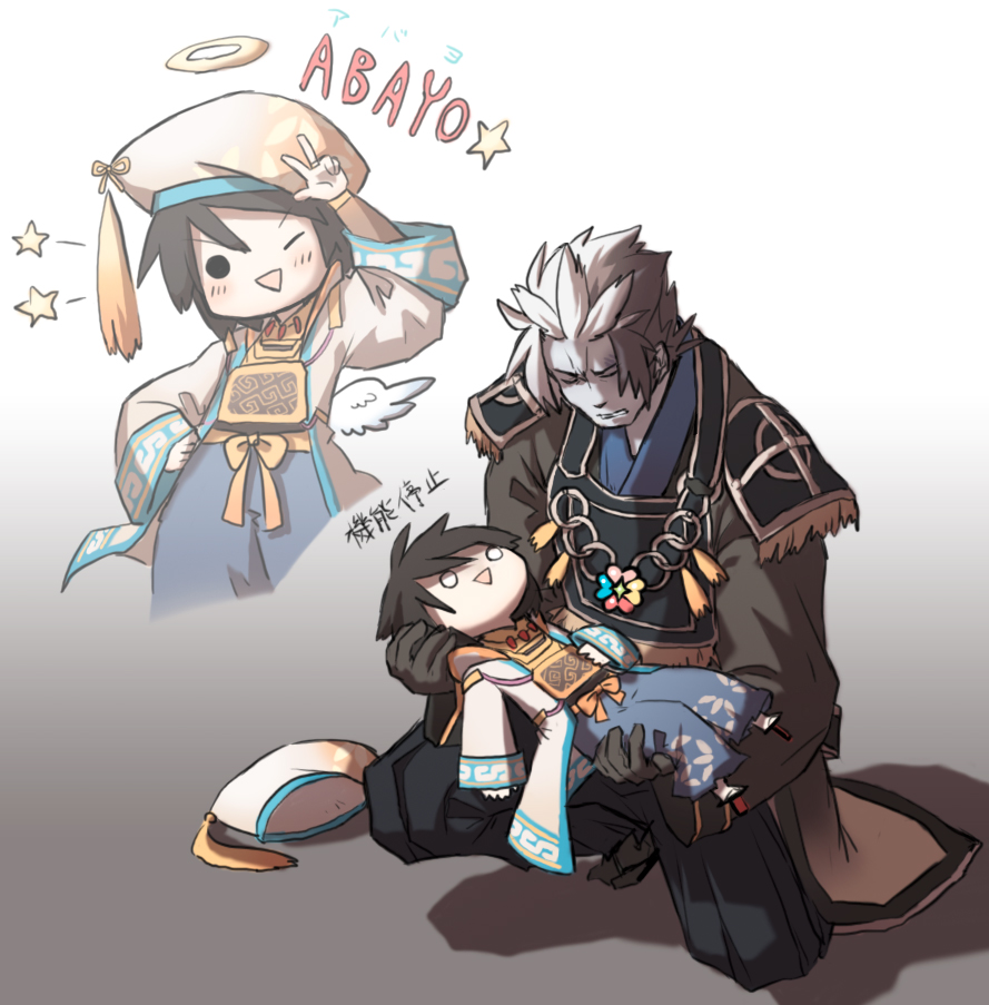 beret black_hair carrying carrying_person chibi death hat japanese_clothes kimono kuroda_kanbei_(sengoku_musou) multicolored_hair sengoku_musou takenaka_hanbei_(sengoku_musou) two-tone_hair