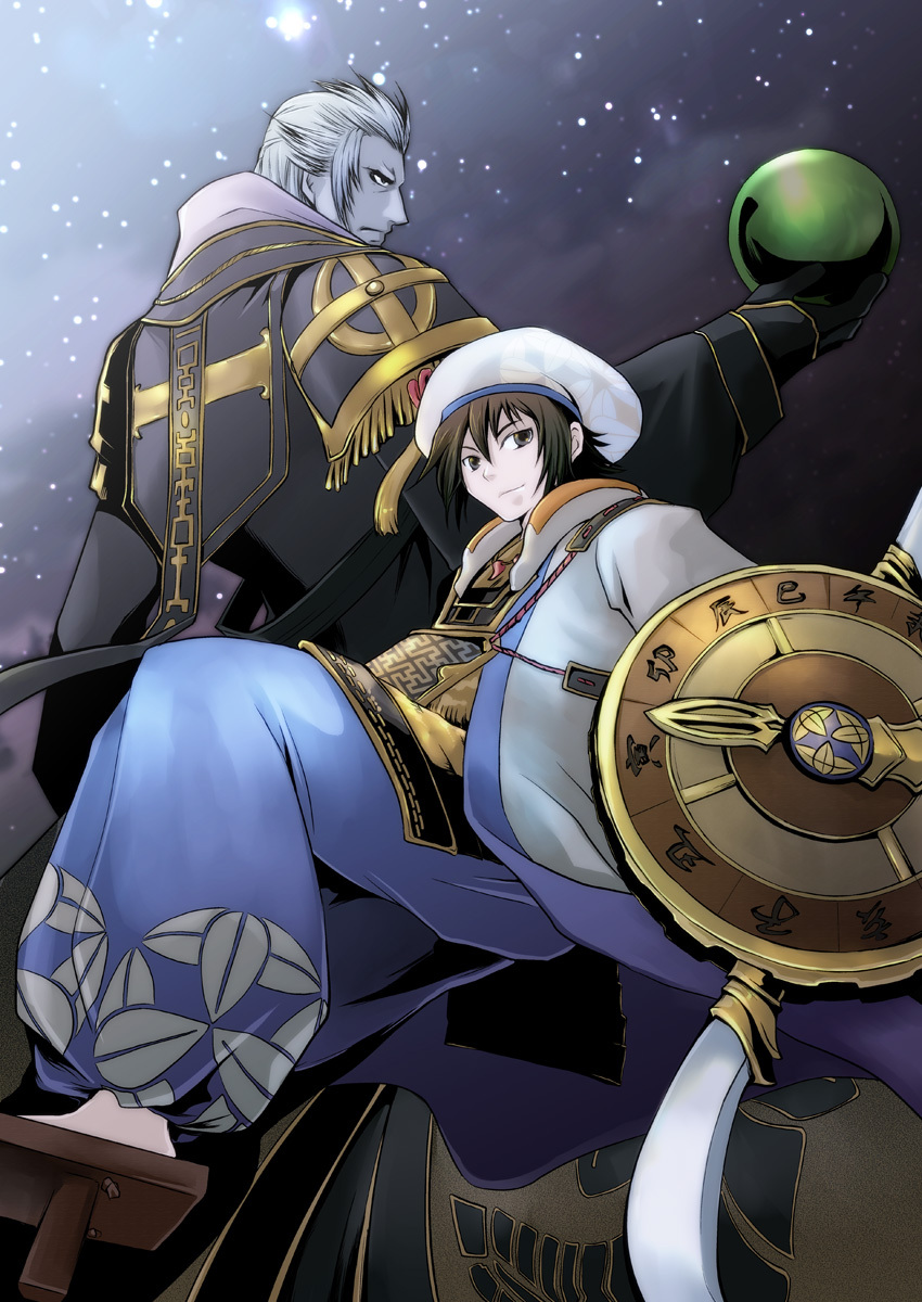 beret brown_hair hakama hat highres japanese_clothes kimono kuroda_kanbei_(sengoku_musou) multicolored_hair orb sandals sengoku_musou sky star_(sky) starry_sky takenaka_hanbei_(sengoku_musou) two-tone_hair