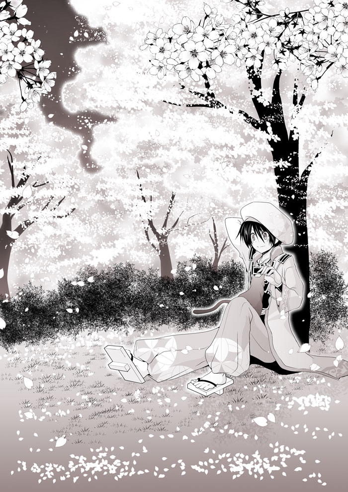 beret black_hair cat hakama hat japanese_clothes kimono monochrome petals platform_sandals sandals sengoku_musou sitting smile takenaka_hanbei_(sengoku_musou) tree
