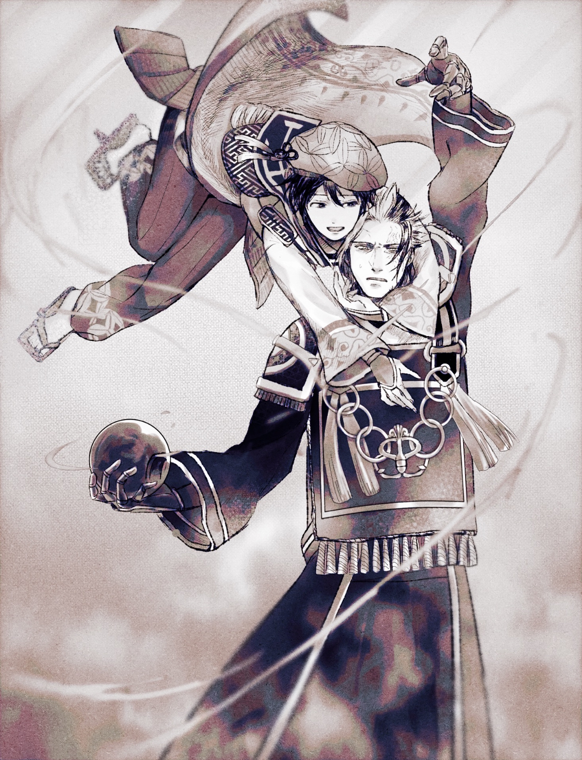 arms_around_neck beret black_hair coat hat highres japanese_clothes jumping kimono kuroda_kanbei_(sengoku_musou) multicolored_hair orb robe sengoku_musou smile takenaka_hanbei_(sengoku_musou) two-tone_hair