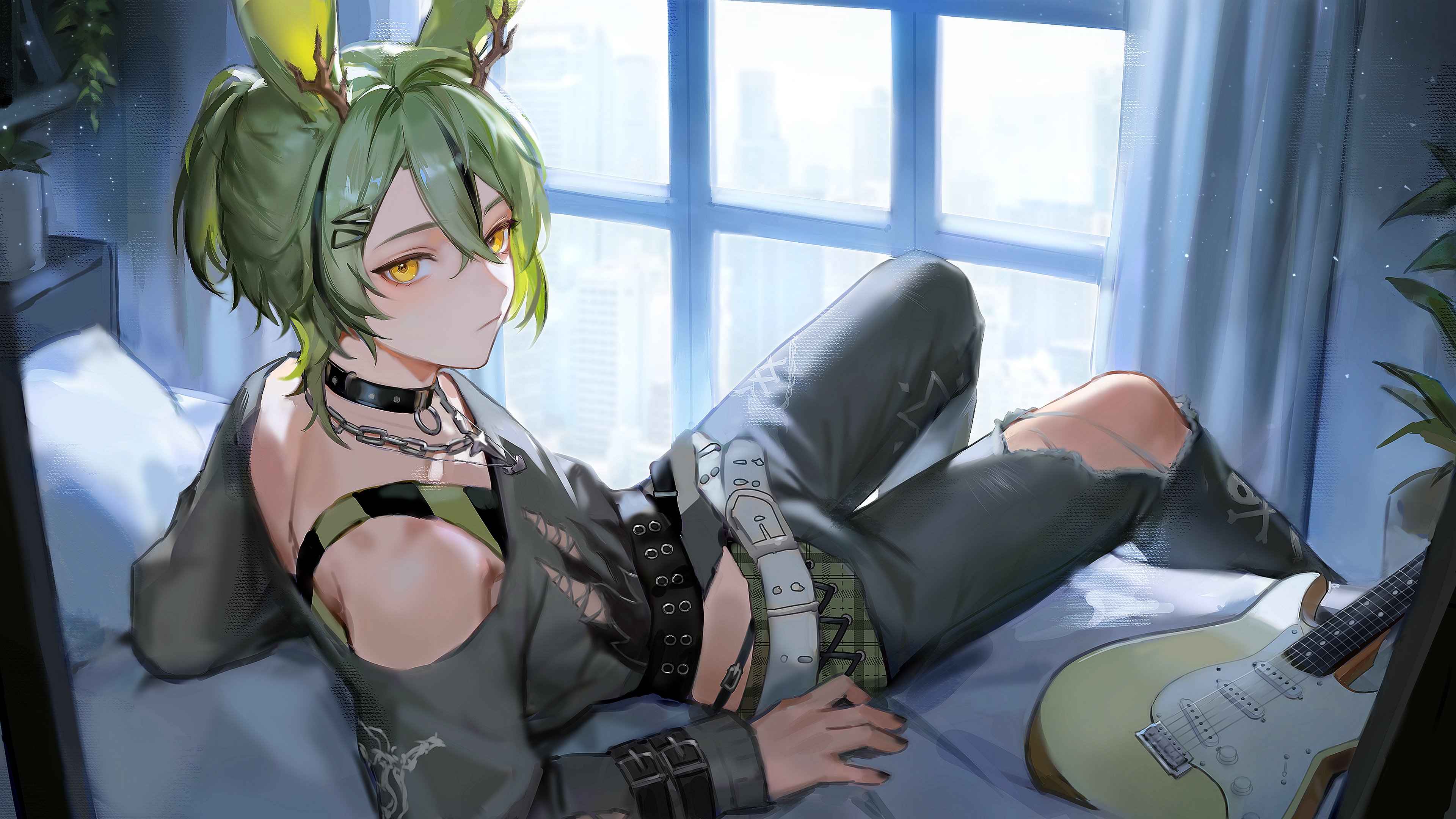 1boy absurdres animal_ears bass_guitar belt black_choker chain chain_necklace choker commission eri11rie green_hair grey_pants grey_shirt hair_branch highres indie_virtual_youtuber indoors instrument jewelry long_sleeves looking_at_viewer necklace off-shoulder_shirt off_shoulder on_bed pants ponytail rabbit_ears shirt solo torn_clothes torn_pants torn_shirt virtual_youtuber window yellow_eyes