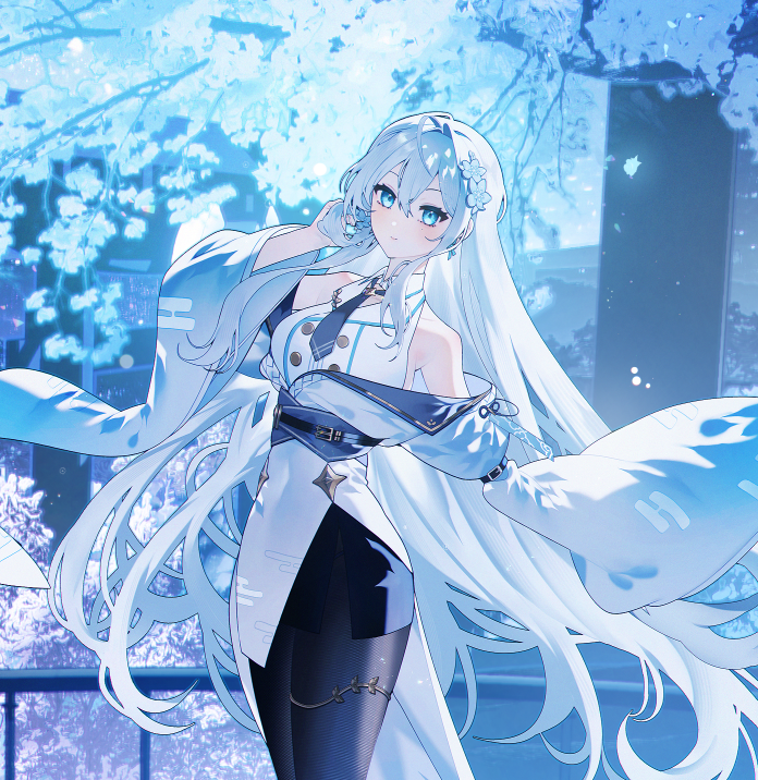 1girl black_pantyhose black_skirt blue_eyes chyari coat dress hair_ornament indie_virtual_youtuber long_hair long_sleeves looking_at_viewer miniskirt necktie off_shoulder pantyhose sash shirt skirt sleeveless sleeveless_shirt solo standing very_long_hair virtual_youtuber white_coat white_hair white_shirt wide_sleeves