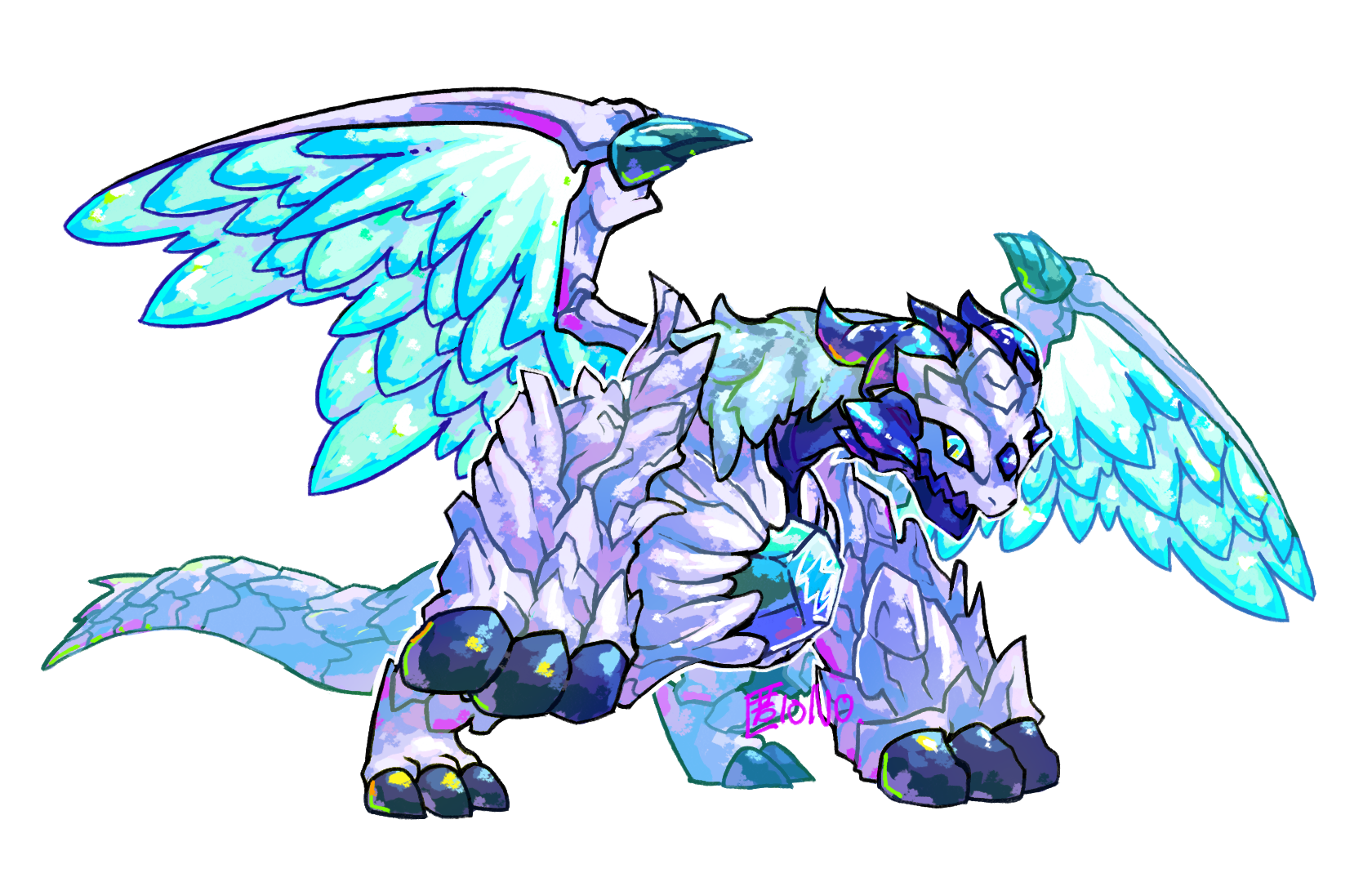 blue_gem blue_wings character_request commentary_request dragon dragon_village_(series) dragon_village_collection feathered_wings full_body gem highres no_humans simple_background tok10n0 white_background wings