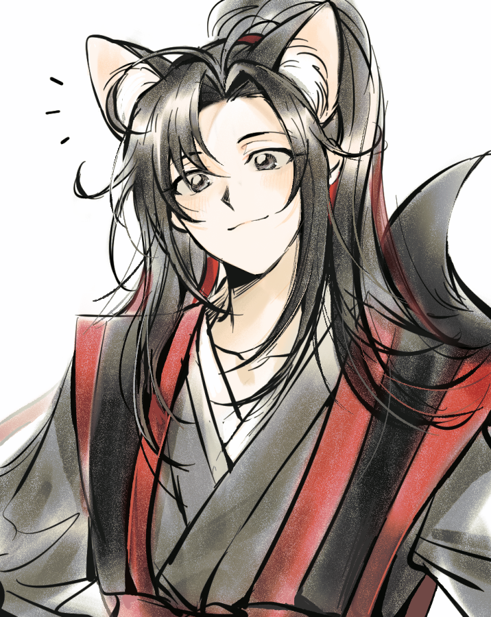 1boy :3 ahoge animal_ear_fluff animal_ears black_eyes black_hair black_hanfu chinese_clothes closed_mouth collarbone fox_boy fox_ears fox_tail hair_ribbon hanfu head_tilt kemonomimi_mode korean_commentary long_hair long_sleeves looking_at_viewer magamhani male_focus modao_zushi notice_lines ponytail red_ribbon ribbon sash sidelocks simple_background smile solo tail tunic upper_body wei_wuxian wei_wuxian_(yunmeng_clan) white_background
