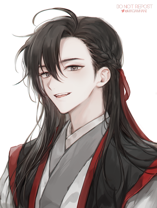 1boy :d ahoge bishounen black_hair black_hanfu braid chinese_clothes english_text fang grey_eyes hair_between_eyes hair_down hair_ribbon half_up_braid half_updo hanfu korean_commentary long_hair looking_at_viewer magamhani male_focus modao_zushi official_alternate_hairstyle open_mouth red_ribbon ribbon simple_background smile solo teeth twitter_username upper_body wei_wuxian wei_wuxian_(yiling_laozu) white_background