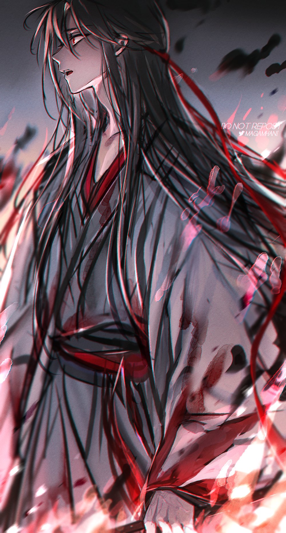1boy bishounen black_hair black_hanfu black_smoke blood blood_on_clothes burning chinese_clothes coat colored_smoke fire from_side grey_coat hair_down hair_ribbon half_updo hanfu headband highres holding korean_commentary long_hair long_sleeves looking_to_the_side magamhani male_focus modao_zushi night official_alternate_costume official_alternate_hairstyle open_mouth profile red_eyes red_ribbon ribbon robe smoke solo standing twitter_username upper_body very_long_hair watermark weapon wei_wuxian wei_wuxian_(yiling_laozu)