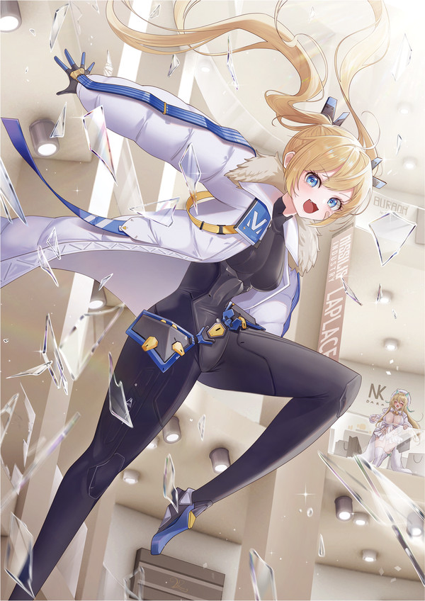 1girl broken_glass broken_window glass glass_shards goddess_of_victory:_nikke laplace_(nikke) shopping_mall smile