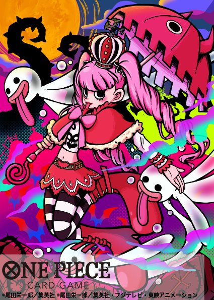 1girl black_eyes blunt_bangs boots bow bowtie capelet commentary_request copyright_name crown full_body ghost holding holding_umbrella long_sleeves looking_at_viewer lower_eyelashes_only moon naaa22g official_art one_piece one_piece_card_game pantyhose perona pink_bow pink_bowtie pink_hair solo striped_clothes striped_pantyhose tongue tongue_out twintails umbrella