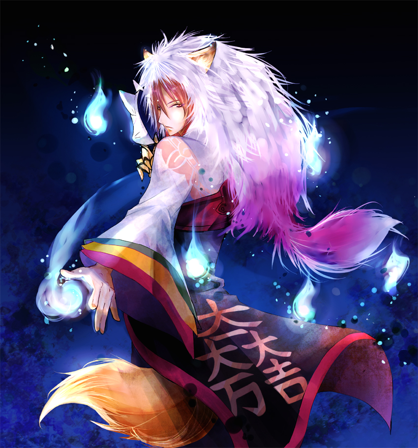 animal_ears brown_hair coat fox_ears fox_mask fox_tail ishida_mitsunari_(sengoku_musou) male_focus mask sengoku_musou tail will-o'-the-wisp_(mythology)