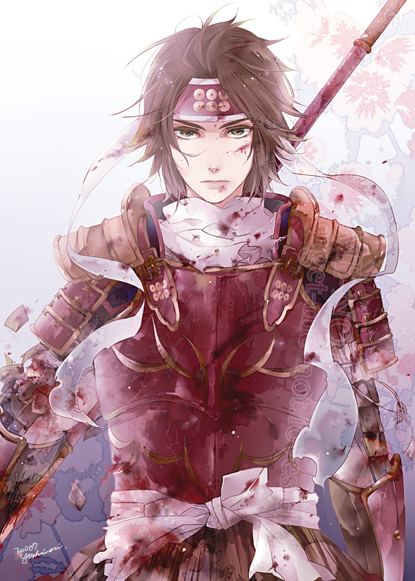 blood blood_on_clothes blood_on_face brown_hair headband male_focus polearm sanada_yukimura_(sengoku_musou) sengoku_musou spear weapon yoshinori_(pixiv358764)