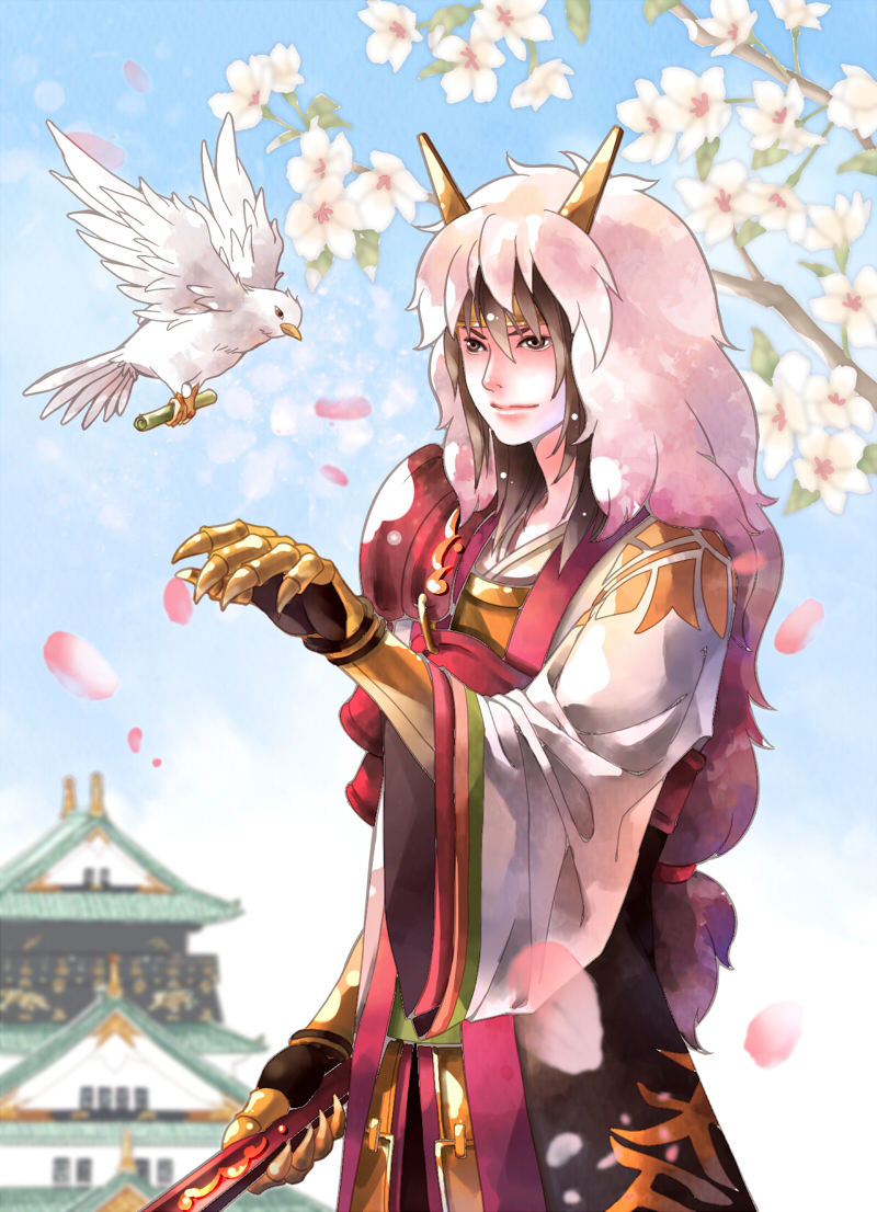 bird brown_hair castle folding_fan hand_fan headdress ishida_mitsunari_(sengoku_musou) japanese_clothes kimono male_focus petals scroll sengoku_musou smile