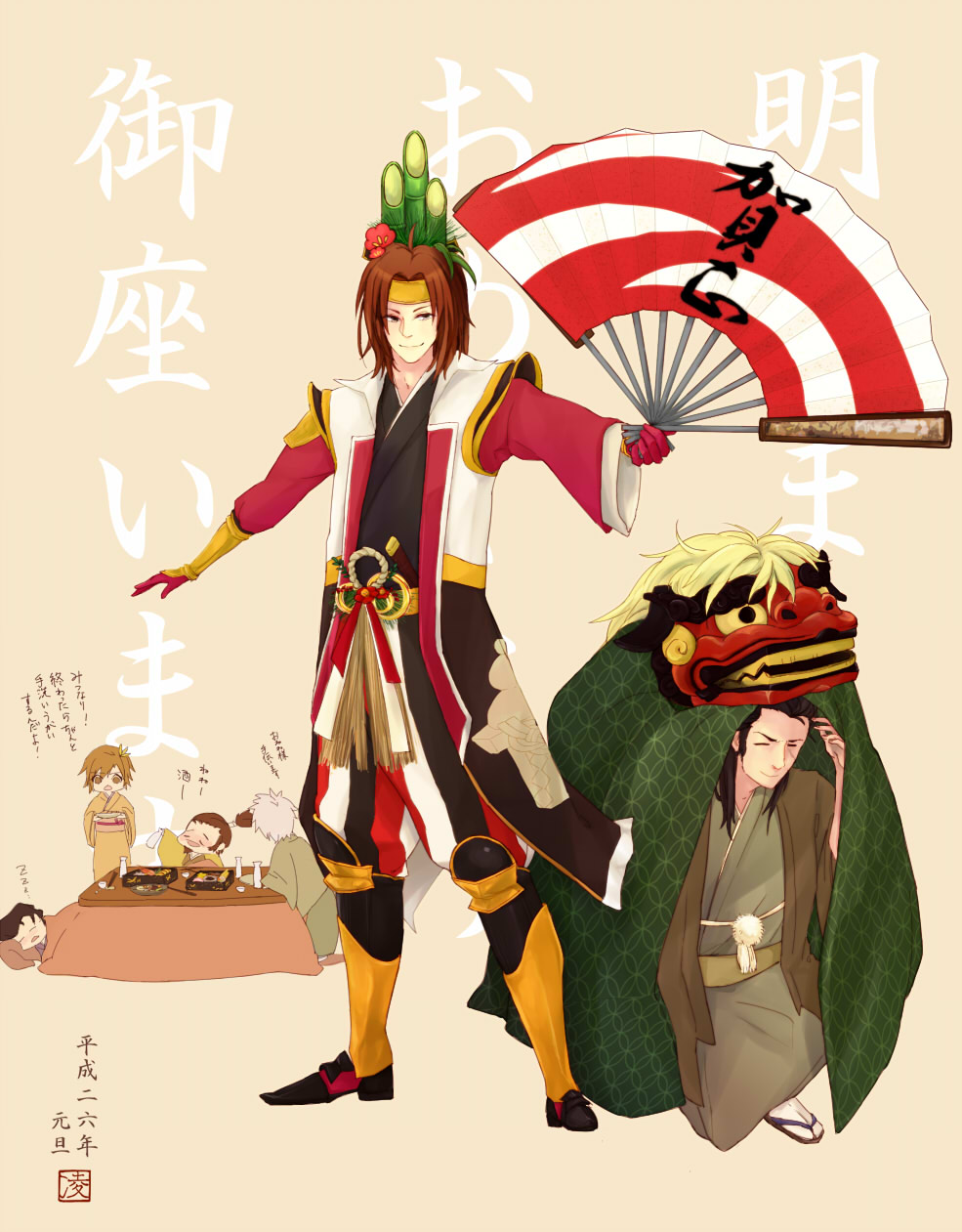 alcohol animal_costume armor bento bottle brown_hair chibi coat dragon_costume eating folding_fan fukushima_masanori_(sengoku_musou) hand_fan highres ishida_mitsunari_(sengoku_musou) japanese_clothes kimono male_focus nene_(sengoku_musou) sake sake_bottle sengoku_musou shima_sakon_(sengoku_musou) sleeping toyotomi_hideyoshi_(sengoku_musou)