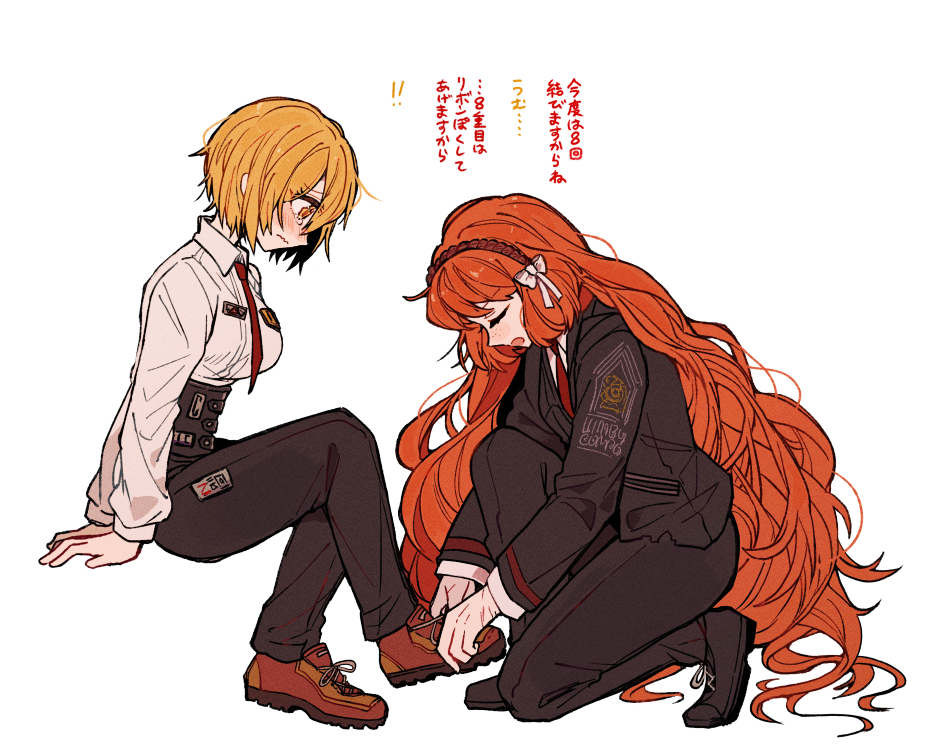 2girls black_coat black_pants black_shoes blonde_hair bow breasts brown_hairband brown_shoes coat collared_shirt don_quixote_(project_moon) freckles full_body hair_bow hairband ishmael_(project_moon) limbus_company long_hair long_sleeves looking_at_another multiple_girls necktie open_mouth orange_hair pants project_moon red_necktie shirt shoes short_hair simple_background sitting tearing_up tying_footwear very_long_hair white_background white_bow white_shirt yellow_eyes yono_neie