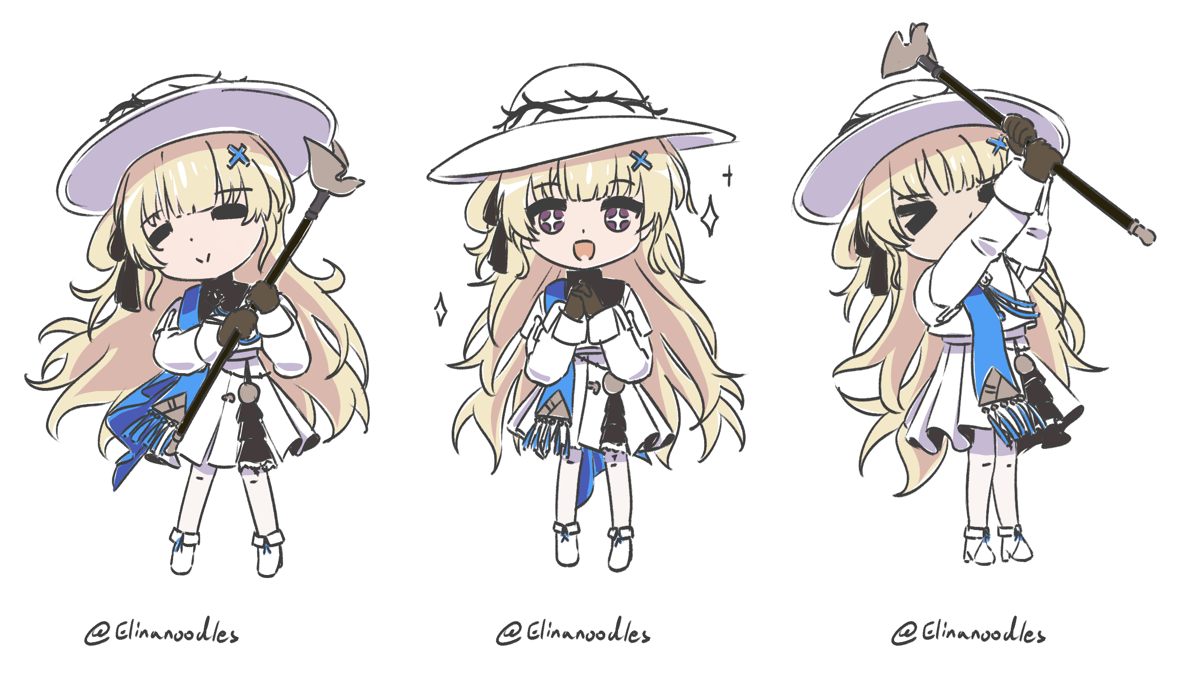 >_< elinanoodles hair_ornament hat highres holding holding_weapon multiple_expressions original pantyhose phoebe_(wuthering_waves) standing star_(symbol) watermark weapon white_background wuthering_waves x_hair_ornament