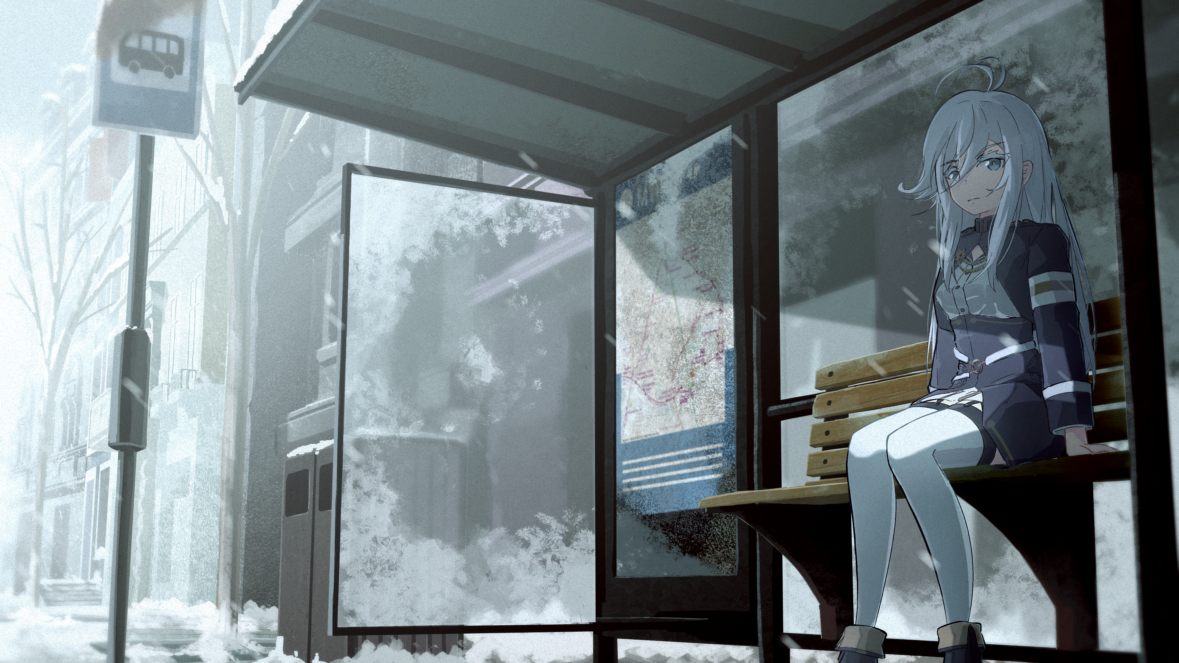86_-eightysix- absurdres belt bus_stop elinanoodles feet_out_of_frame grey_eyes highres looking_to_the_side military_uniform o-ring o-ring_belt sitting snow solo vladilena_millize white_hair