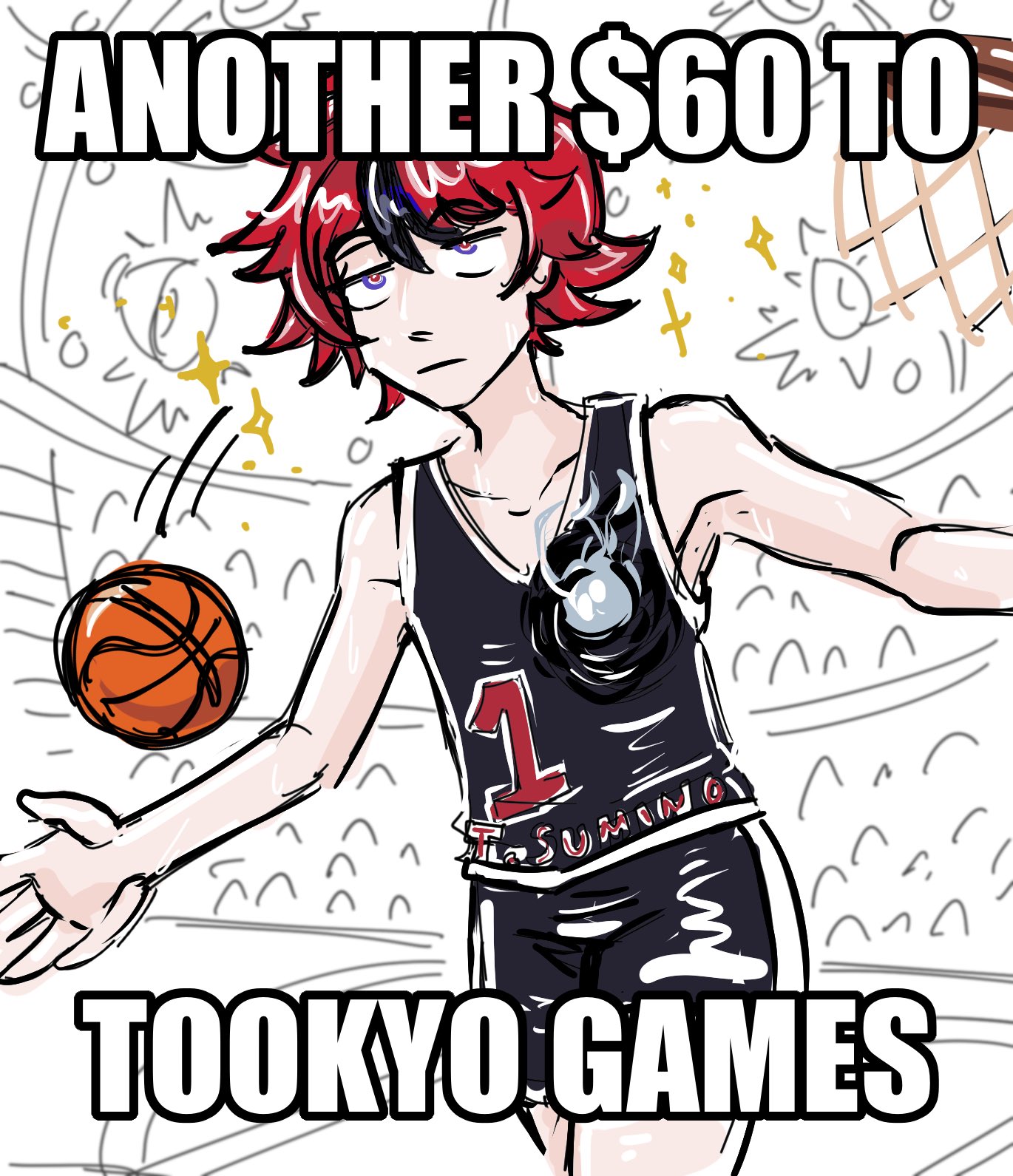 1boy armpits ball basketball basketball_(object) basketball_court basketball_hoop basketball_jersey basketball_shorts black_hair blue_eyes collarbone english_text highres impact_(font) male_focus multicolored_eyes multicolored_hair red_eyes red_hair simple_background sketch solo sumino_takumi the_hundred_line_-last_defense_academy-