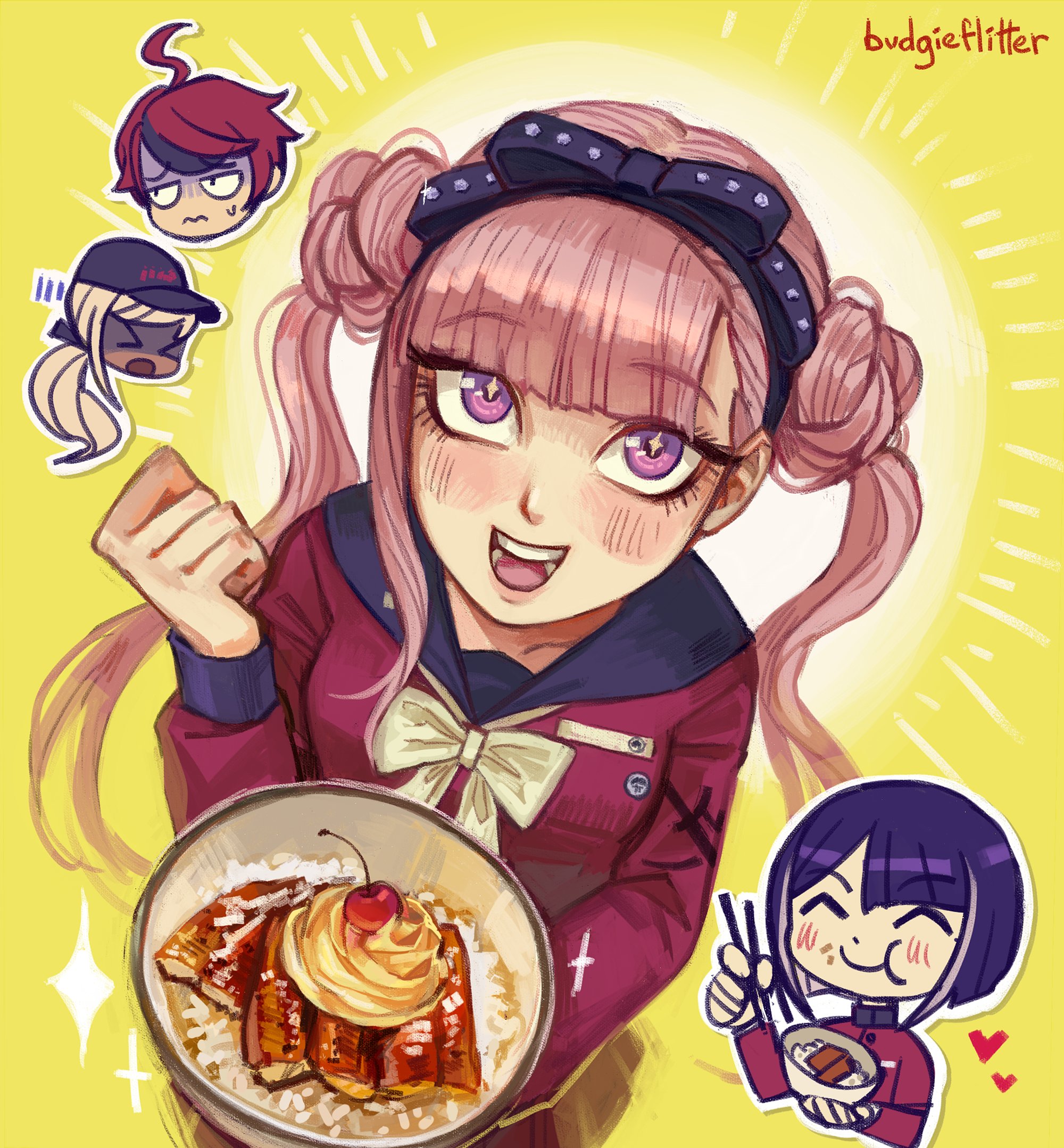 ahoge black_bow black_hair blonde_hair blush bow collarbone custard eating eel food hair_between_eyes happy highres kawana_tsubasa long_hair long_sleeves looking_at_viewer multicolored_hair open_mouth pink_eyes pink_hair purple_hair red_eyes sumino_takumi teeth the_hundred_line_-last_defense_academy- tongue tsukumo_ima tsukumo_kako twintails upper_teeth_only yellow_background