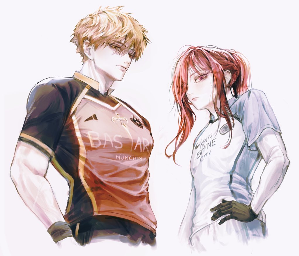 2boys black_gloves blonde_hair blue_lock bracelet chigiri_hyoma closed_mouth compression_shirt ffeine gloves hair_between_eyes height_difference jewelry kunigami_rensuke long_hair long_sleeves looking_at_viewer male_focus multiple_boys muscular red_eyes red_hair shirt short_hair simple_background soccer_uniform sportswear standing toned toned_male upper_body white_background yellow_eyes