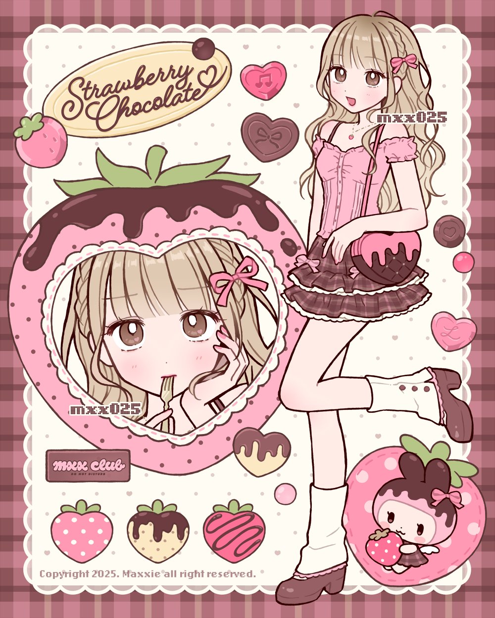 1girl bag blonde_hair braid brown_bag brown_shoes brown_skirt chocolate-covered_food chocolate_strawberry commentary creature english_commentary english_text fashion food fork frilled_skirt frills fruit hair_ribbon handbag heart-shaped_bag high_heels highres jewelry leg_warmers long_hair multiple_views mxx025 neapolitan_palette necklace original pink_ribbon pink_shirt ribbon shirt shoes skirt standing standing_on_one_leg strawberry white_leg_warmers