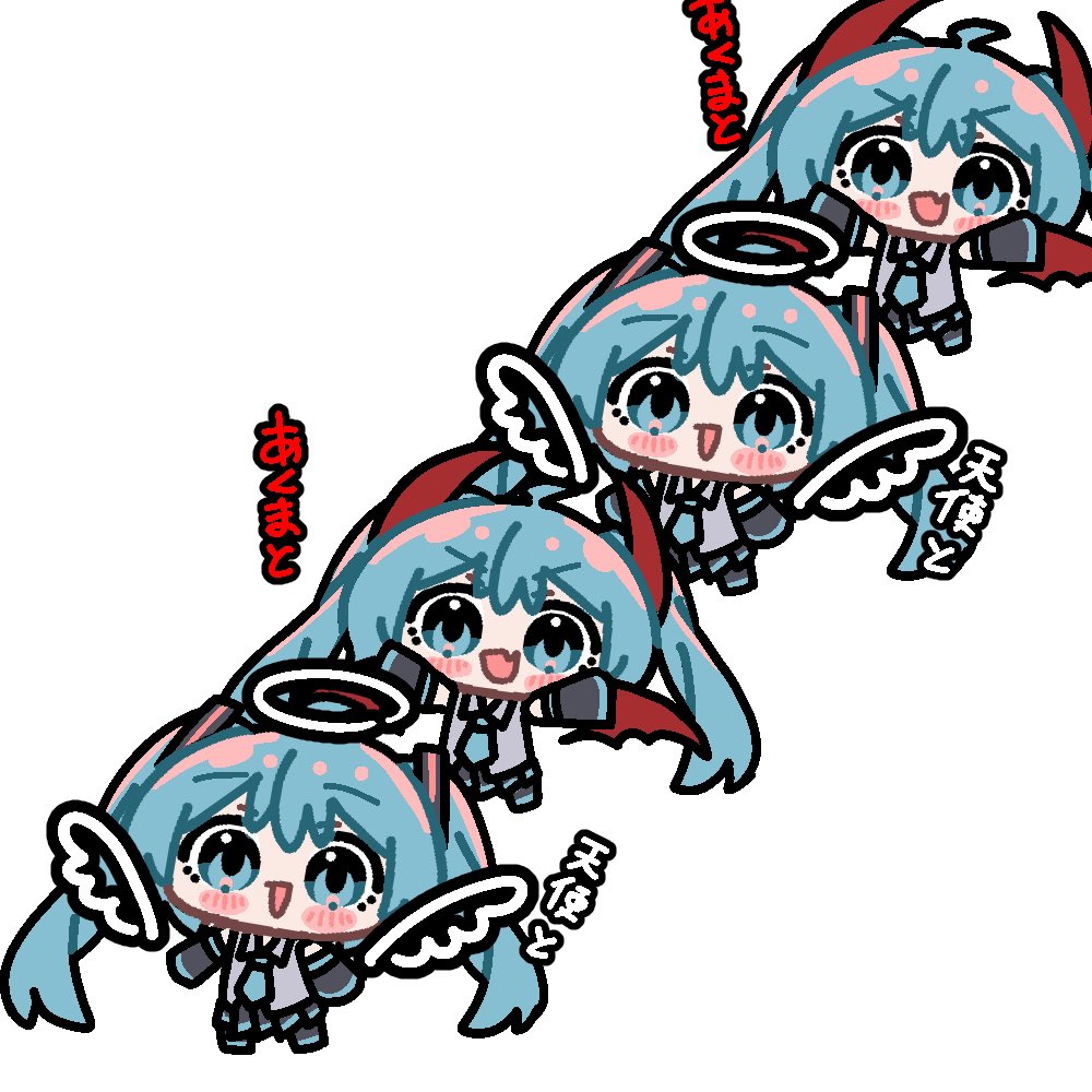 4girls :d angel_wings black_shoes black_skirt black_sleeves blue_eyes blue_hair blue_necktie blush chibi chibi_only clone collared_shirt demon_horns demon_wings detached_sleeves drawn_halo drawn_horns drawn_wings fang grey_shirt hair_ornament halo hands_up hatsune_miku horns long_hair long_sleeves multiple_girls necktie open_mouth pleated_skirt shirt shoes simple_background skin_fang skirt smile standing tententengokujigokugoku_(aiobahn) translation_request twintails v-shaped_eyebrows very_long_hair vocaloid white_background wings yukkuri_yuduki
