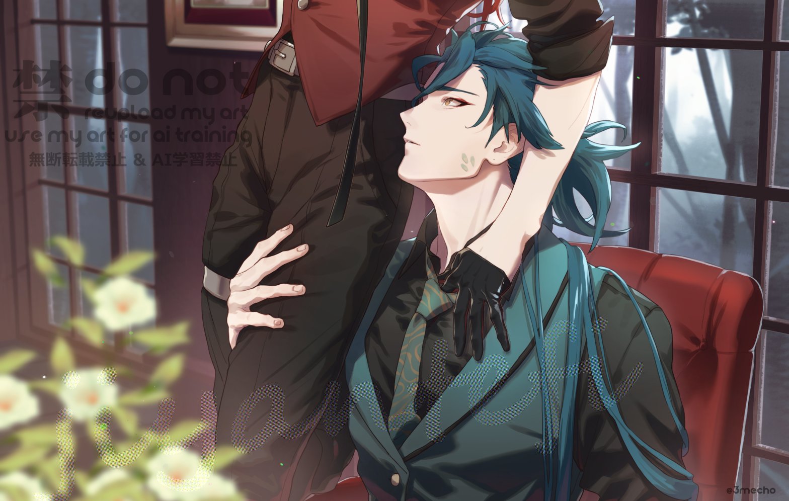 2boys artist_name belt belt_buckle black_gloves black_pants black_shirt blue_hair blue_necktie blue_vest blurry blurry_foreground buckle chair closed_mouth collared_shirt commentary_request emu_(3mecho) eyeshadow flower gloves grey_belt hair_between_eyes half_gloves hand_on_another's_leg hugging_another's_leg indoors jiyan_(wuthering_waves) long_hair looking_at_another looking_up makeup male_focus mortefi_(wuthering_waves) multiple_boys necktie on_chair pants picture_frame red_eyeshadow red_hair red_vest scales shirt sitting standing thigh_strap tree twitter_username vest watermark white_flower window wuthering_waves yaoi yellow_eyes