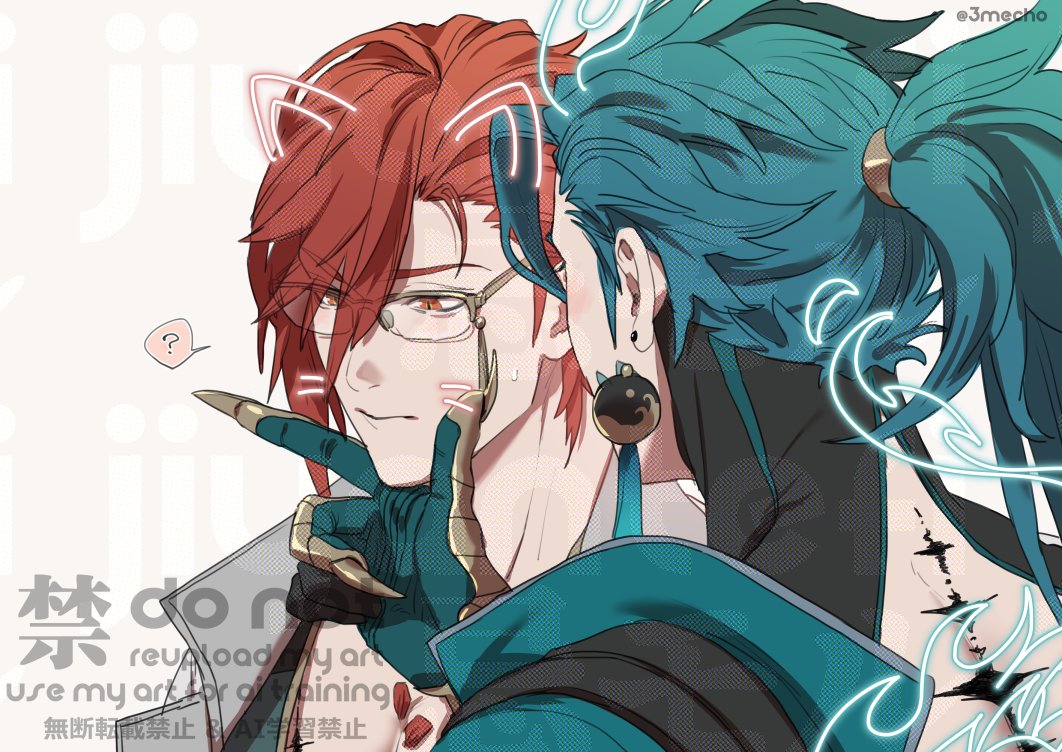 2boys ? artist_name black_gloves black_shirt blue_coat blue_gloves blue_hair closed_mouth coat commentary_request drawn_ears drawn_horns drawn_tail drawn_whiskers earrings emu_(3mecho) facing_away from_behind glasses gloves grey_background hair_between_eyes hand_on_another's_chin hand_up high_ponytail jewelry jiyan_(wuthering_waves) lab_coat long_hair male_focus mortefi_(wuthering_waves) multiple_boys parted_bangs ponytail red_eyes red_hair scales shirt speech_bubble spoken_question_mark sweatdrop tacet_mark_(wuthering_waves) tassel tassel_earrings twitter_username two-tone_gloves upper_body v-shaped_eyebrows watermark white_coat wuthering_waves