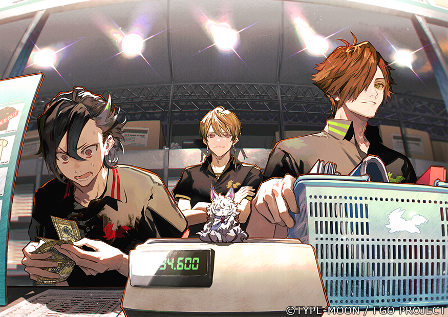 3boys banknote basket black_hair blonde_hair cash_register collared_shirt commentary_request creature crossed_arms earrings employee_uniform fate/grand_order fate_(series) fou_(fate) gilgamesh gilgamesh_(caster)_(fate) gilgamesh_(fate) green_eyes hair_between_eyes hair_over_one_eye holding holding_basket holding_money jewelry looking_at_viewer male_focus mandricardo_(fate) money multicolored_hair multiple_boys nozaki_tsubata official_art open_mouth orange_hair promotional_art red_eyes robin_hood_(fate) shirt short_hair smile streaked_hair sweatdrop white_hair