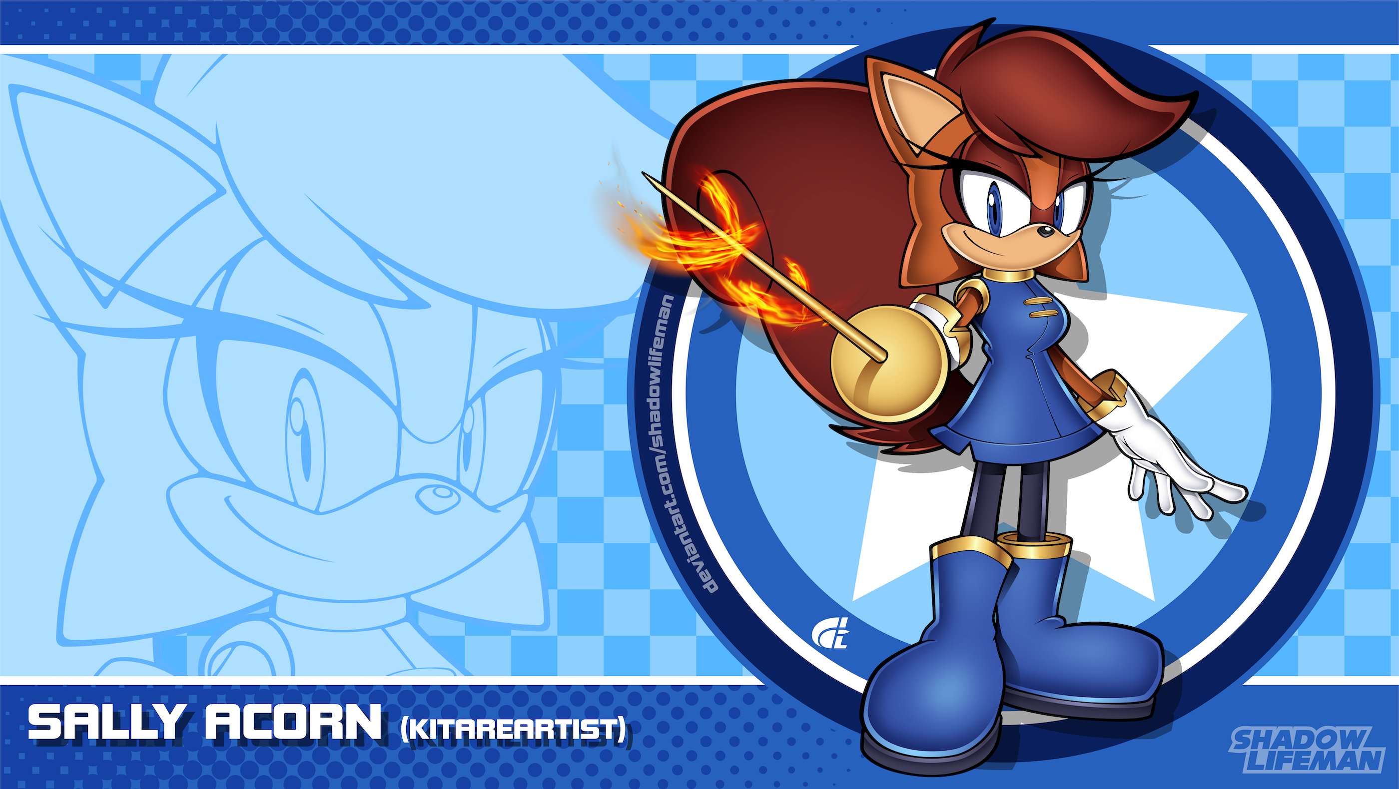 1girl artist_name blue_eyes character_name closed_mouth commentary english_commentary english_text gloves highres holding holding_sword holding_weapon sally_acorn shadowlifeman smile solo sonic_(series) sword watermark weapon web_address white_gloves