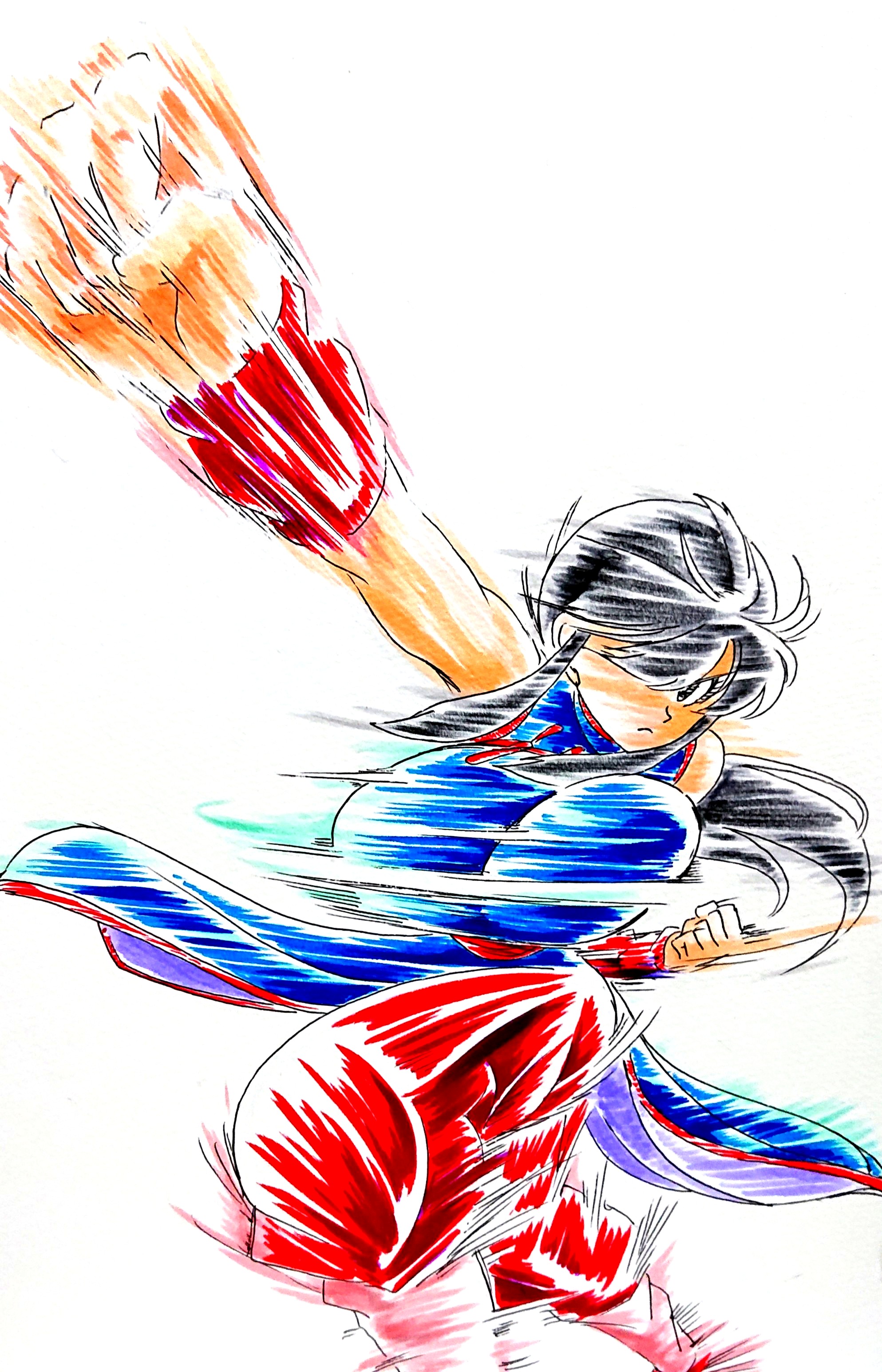 1girl absurdres area5169458561 black_hair blush breasts chi-chi_(dragon_ball) chinese_clothes dragon_ball dress fighting highres large_breasts motion_lines pants ponytail punching sitting traditional_media wristband