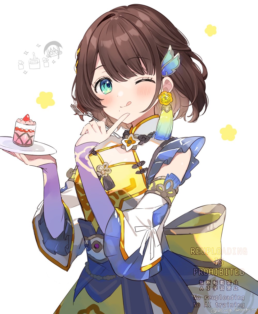 1girl 6crcg ;q arm_warmers artist_name back_bow blue_eyes blunt_bangs blush bow braid cake chinese_clothes closed_mouth clothing_cutout detached_sleeves dress earrings eyelashes food fork frilled_sleeves frills fruit hair_ornament hair_ribbon hands_up hashtag-only_commentary highres holding holding_fork holding_plate index_finger_raised jewelry looking_at_viewer mandarin_collar mole mole_under_mouth multicolored_dress nijisanji one_eye_closed parted_bangs plate purple_arm_warmers purple_hair ribbon ribbon_braid shiga_riko shiga_riko_(1st_costume) short_hair simple_background single_braid sleeveless sleeveless_dress smile solo strawberry tassel tassel_earrings tongue tongue_out twitter_username virtual_youtuber watermark white_background white_dress white_ribbon white_sleeves wing_hair_ornament yellow_bow yellow_dress yellow_ribbon