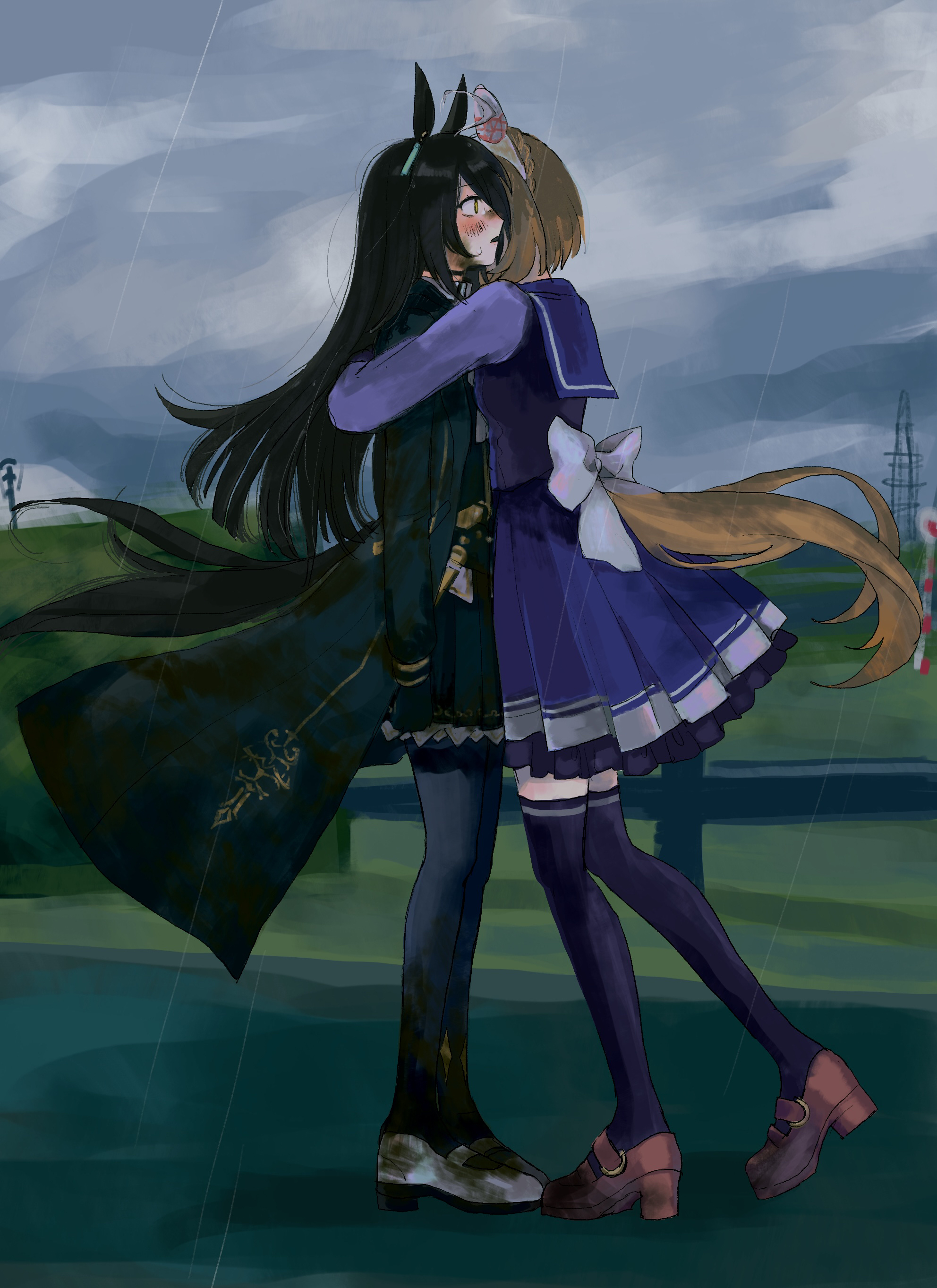 2girls absurdres ahoge animal_ears arms_at_sides black_coat black_gloves black_hair black_pantyhose black_shirt blush brown_hair brown_shoes clothing_cutout cloud cloudy_sky coat commentary_request dirty dirty_clothes ear_covers full_body gloves highres horse_ears horse_girl horse_tail hug long_hair long_sleeves manhattan_cafe_(creeping_shadow)_(umamusume) manhattan_cafe_(umamusume) multiple_girls open_mouth outdoors pantyhose profile purple_shirt purple_skirt purple_thighhighs rain sailor_collar school_uniform shirt shoes short_hair skirt sky standing subaru_(user_tmwv7722) tail tail_through_clothes thighhighs tracen_school_uniform umamusume white_shoes yellow_eyes yukino_bijin_(umamusume)