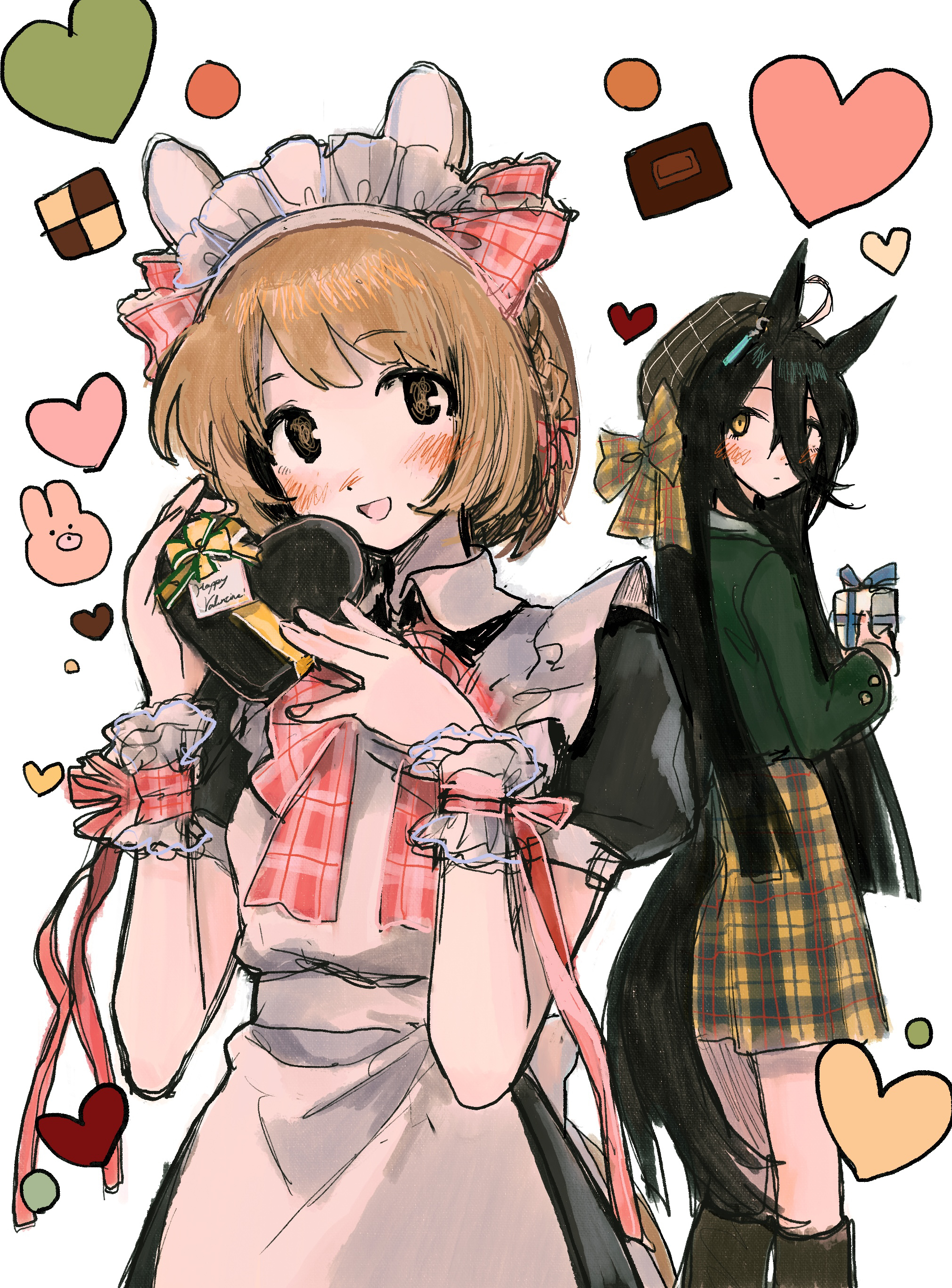 2girls absurdres alternate_costume animal_ears apron black_dress black_hair blush boots bow bowtie box brown_eyes brown_hair closed_mouth collared_dress dress ear_covers enmaided gift gift_box green_shirt hat heart heart-shaped_box highres horse_ears horse_girl horse_tail long_hair long_sleeves looking_at_another looking_at_viewer looking_back maid maid_apron maid_headdress manhattan_cafe_(umamusume) multicolored_hair multiple_girls open_mouth plaid_clothes plaid_skirt puffy_short_sleeves puffy_sleeves scrunchie shirt short_hair short_sleeves skirt standing streaked_hair subaru_(user_tmwv7722) tail umamusume valentine white_background wrist_scrunchie yellow_eyes yellow_skirt yukino_bijin_(umamusume)