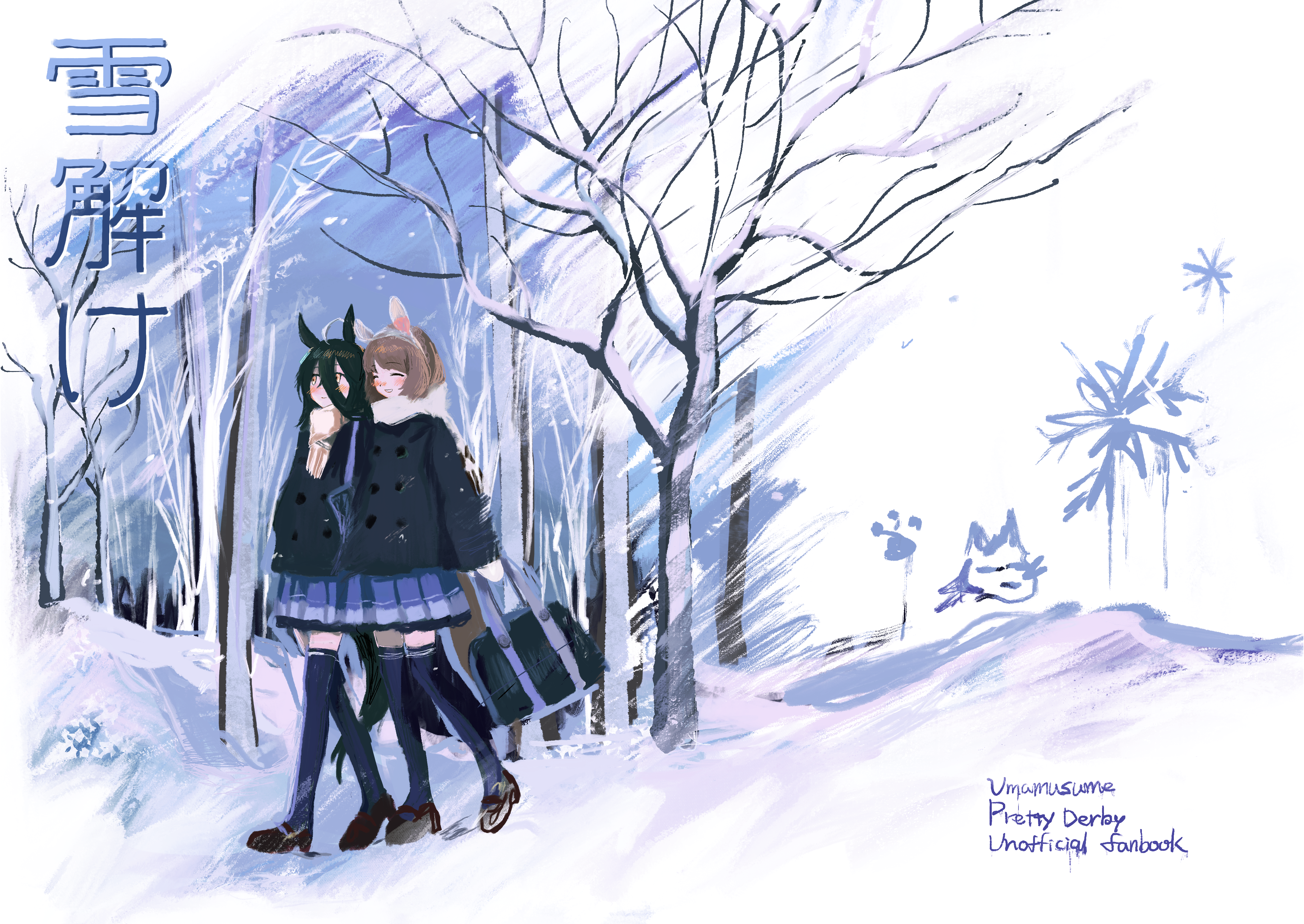 2girls absurdres ahoge animal_ears bag bare_tree black_hair blue_skirt blue_theme blush brown_hair brown_shoes closed_eyes closed_mouth coat copyright_name cover cover_page english_text hair_between_eyes highres holding holding_bag horse_ears horse_girl horse_tail long_sleeves manhattan_cafe_(umamusume) multiple_girls outdoors scarf school_bag school_uniform shoes skirt smile snow subaru_(user_tmwv7722) tail tracen_school_uniform tree umamusume walking yellow_eyes yukino_bijin_(umamusume)