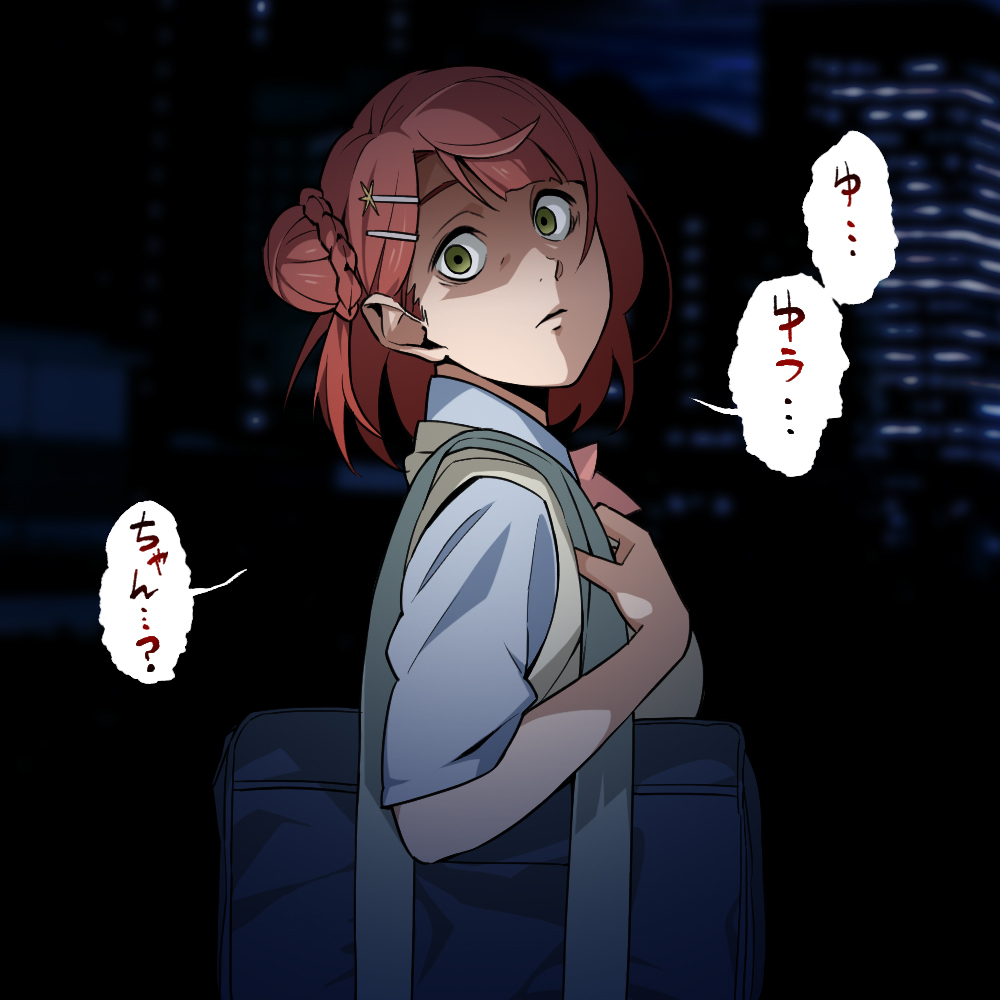 1girl bag blue_shirt brown_eyes brown_hair brown_vest city commentary_request dark_background empty_eyes hair_bun hair_ornament hairclip horror_(theme) looking_at_viewer love_live! love_live!_nijigasaki_high_school_idol_club nijigasaki_school_uniform outdoors school_bag school_uniform shirt solo suzushiro_(suzushiro333) translation_request uehara_ayumu vest yandere