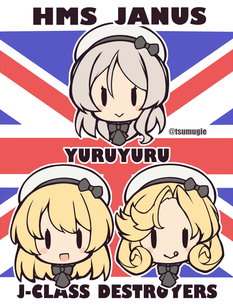 3girls :> :q akikaze_tsumuji blonde_hair blush character_name chibi commentary_request flag_background grey_hair hat head_only janus_(kancolle) javelin_(kancolle) jervis_(kancolle) kantai_collection long_hair multiple_girls open_mouth sailor_collar sailor_hat smile tongue tongue_out twitter_username union_jack