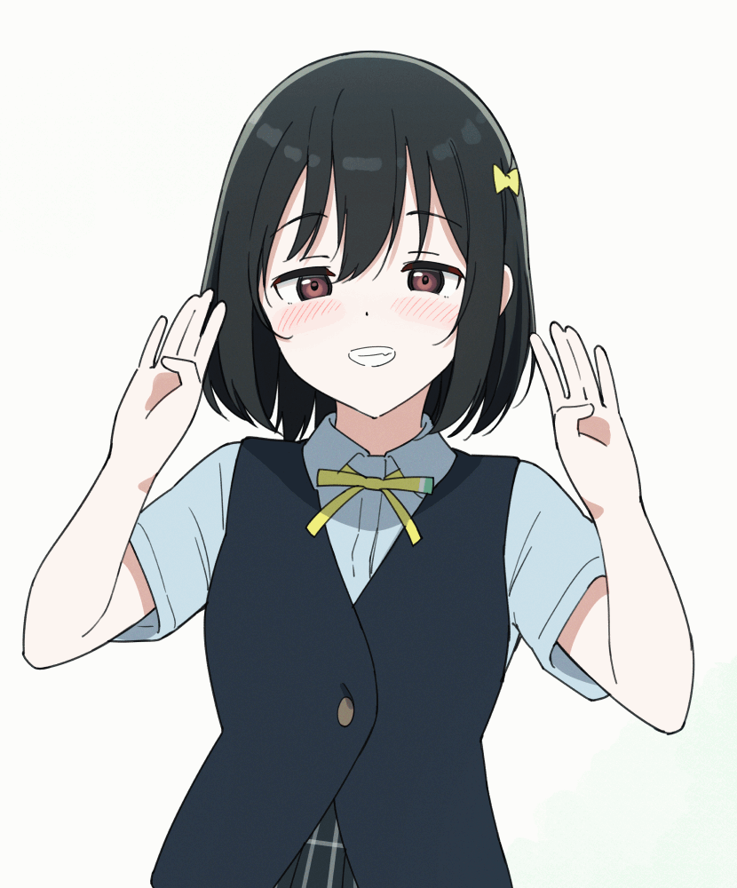 1girl :o animated animated_gif black_hair black_vest blue_shirt blush bob_cut brown_eyes character_name collared_shirt commentary_request dress_shirt fang grin hair_ribbon looking_at_viewer love_live! love_live!_nijigasaki_high_school_idol_club mifune_shioriko neck_ribbon nijigasaki_school_uniform ribbon school_uniform shirt short_hair simple_background smile solo summer_uniform tata_(tataice) upper_body vest white_background yellow_ribbon