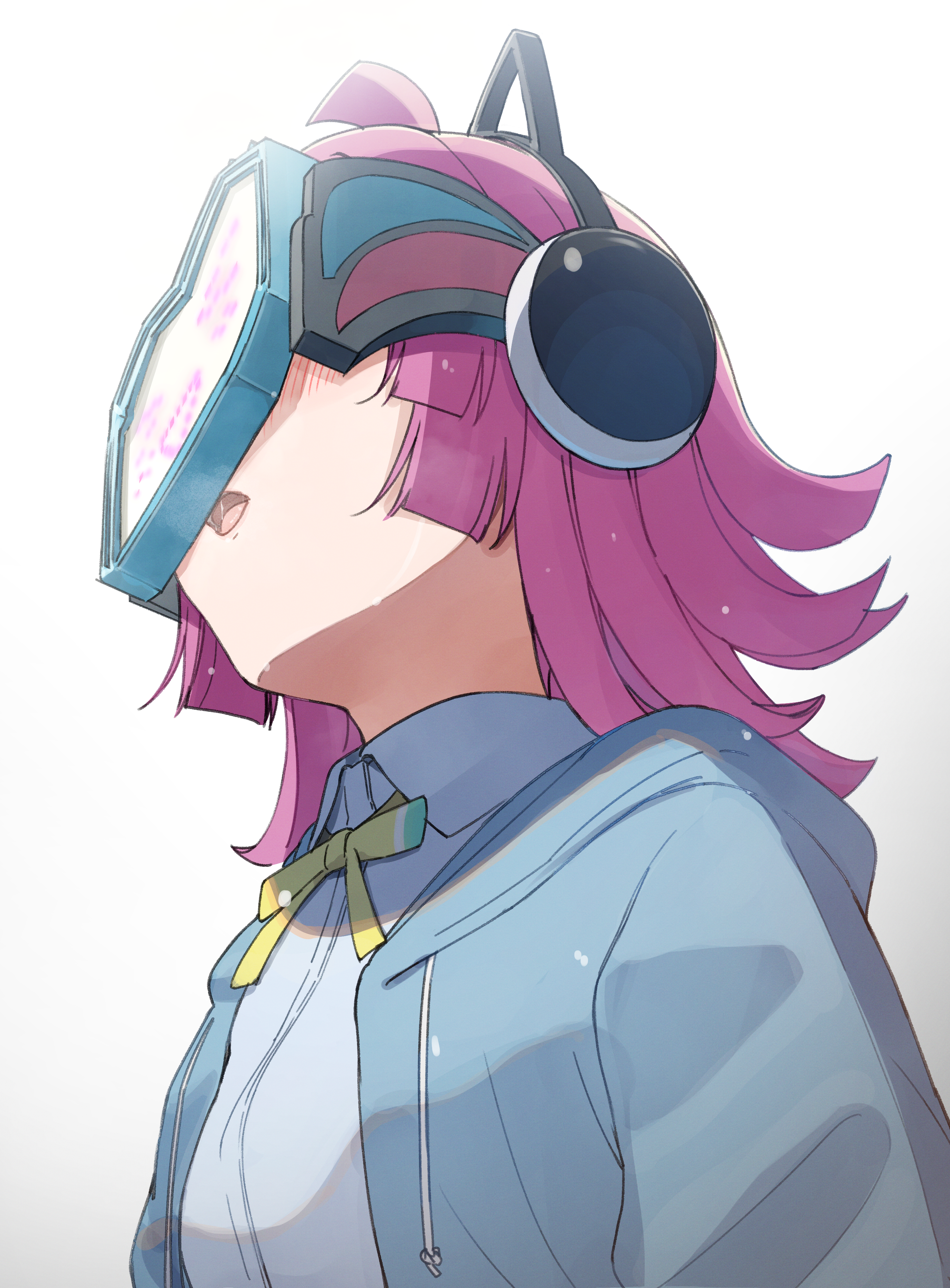 1girl absurdres ahoge animal_ear_headphones animal_ears blue_hoodie blue_shirt blunt_ends blush cat_ear_headphones cat_ears commentary_request fake_animal_ears from_below headphones highres hood hoodie love_live! love_live!_nijigasaki_high_school_idol_club neck_ribbon nijigasaki_school_uniform open_mouth pink_hair ribbon rina-chan_board school_uniform shirt smile tata_(tataice) tennoji_rina white_background yellow_ribbon