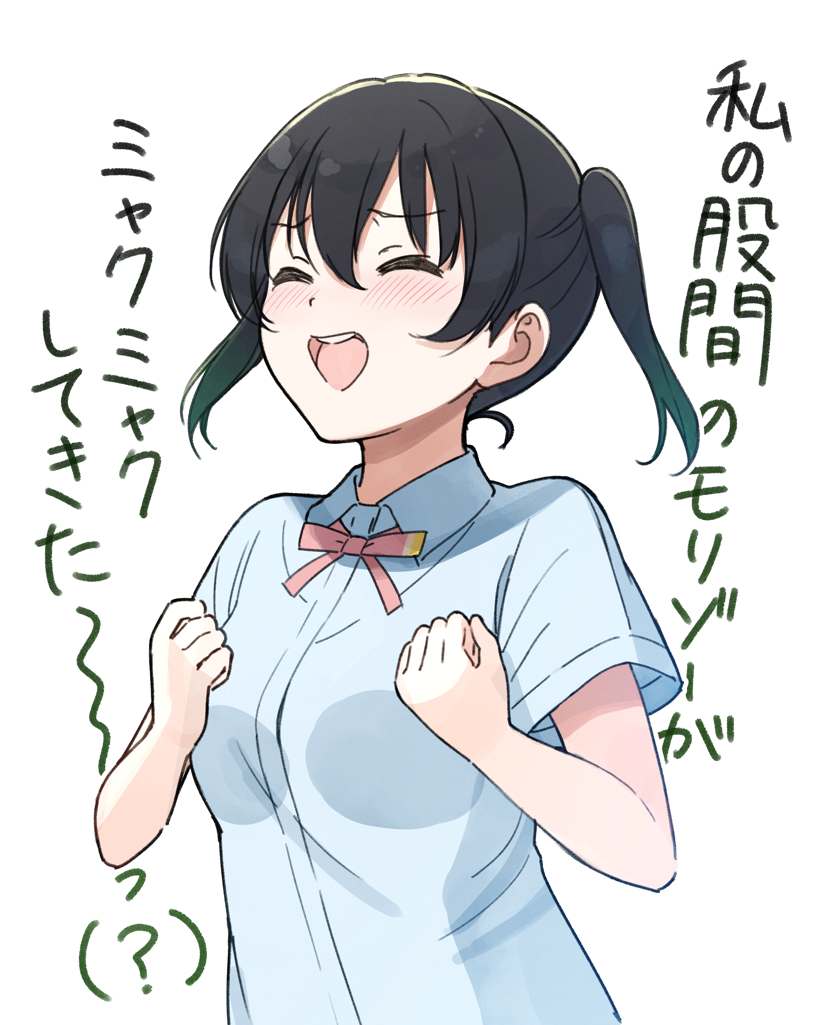 1girl absurdres black_hair blue_shirt blush closed_eyes commentary_request gradient_hair green_hair highres love_live! love_live!_nijigasaki_high_school_idol_club multicolored_hair neck_ribbon nijigasaki_school_uniform open_mouth red_ribbon ribbon school_uniform shirt smile takasaki_yu tata_(tataice) translation_request twintails white_background