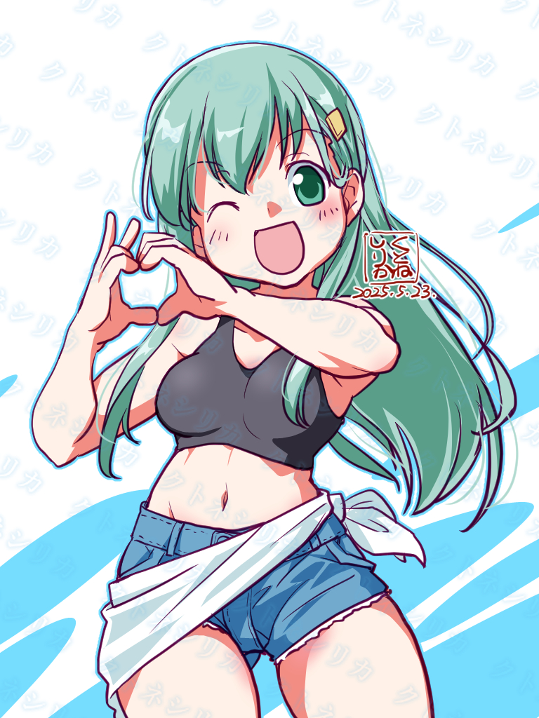 1girl alternate_costume artist_logo blue_shorts breasts casual cowboy_shot cutoffs dated denim denim_shorts green_eyes green_hair grey_sports_bra hair_ornament hairclip heart heart_hands kantai_collection kutone_shirika logo medium_breasts midriff one_eye_closed open_mouth sarong shorts smile solo sports_bra suzuya_(kancolle) white_sarong