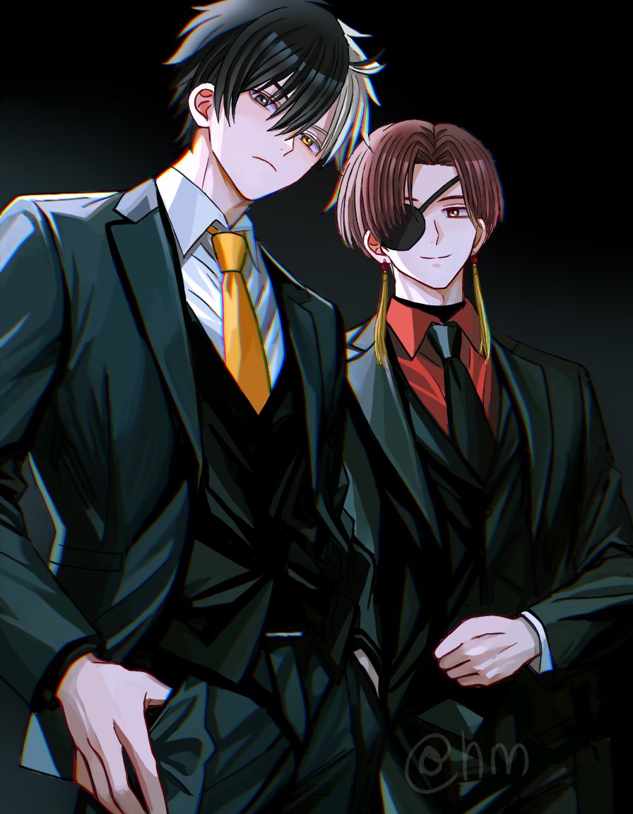 2boys black_background black_eyes black_hair black_jacket black_necktie black_pants black_suit black_vest closed_mouth eyepatch forehead formal_clothes gradient_background grey_hair hair_between_eyes heterochromia hyohls2_(hamao3o) jacket looking_at_viewer male_focus multicolored_hair multiple_boys necktie pants red_eyes red_hair red_shirt sakura_haruka_(wind_breaker) shirt short_hair smile suit suo_hayato two-tone_hair vest white_shirt wind_breaker_(nii_satoru) yellow_eyes yellow_necktie