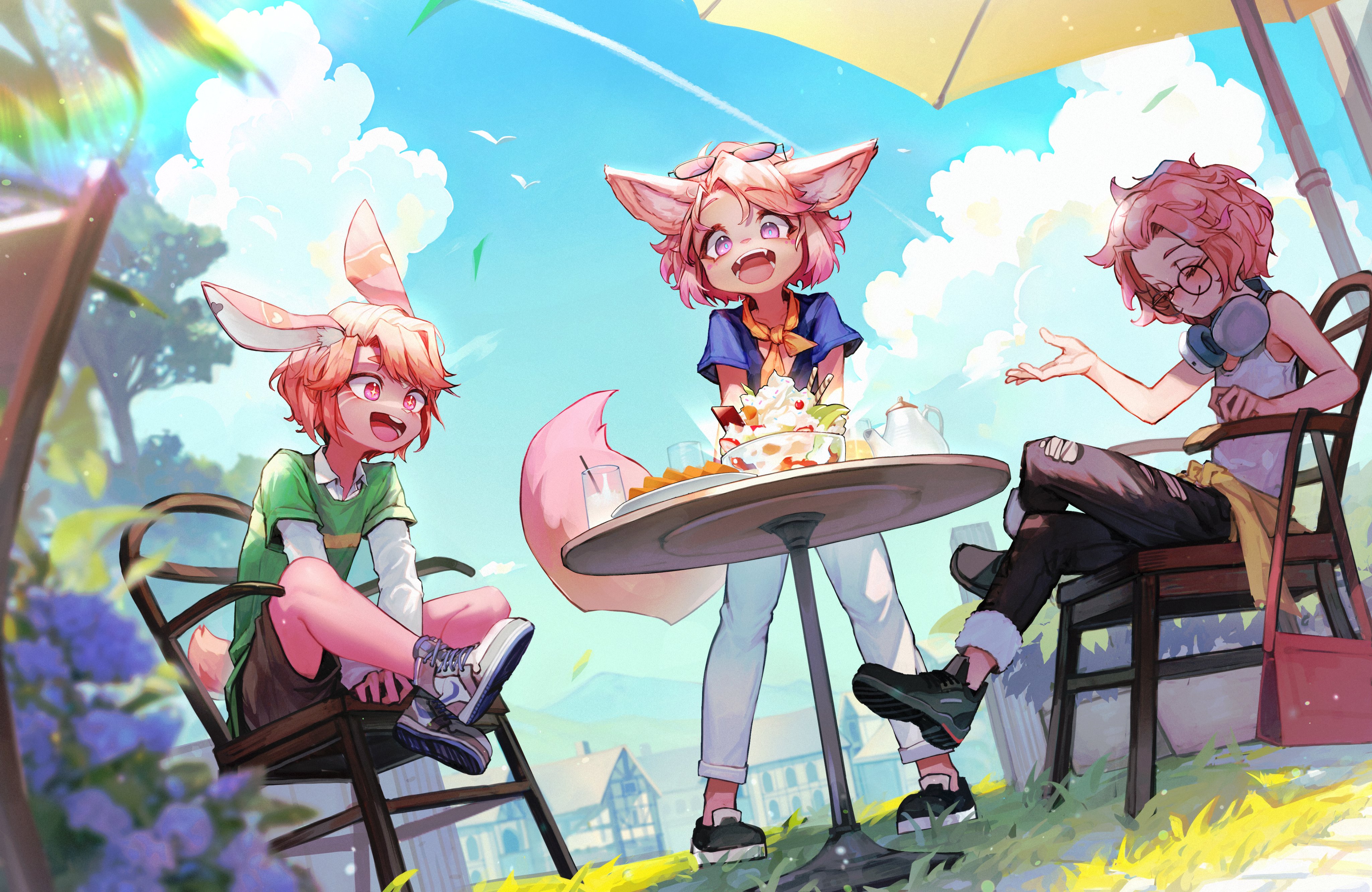 3boys absurdres animal_ears bag black_pants blue_shirt blurry blurry_foreground borrowed_character building clothes_around_waist cloud commission contrail crossed_legs cumulonimbus_cloud cup day drinking_glass eyewear_on_head flower food fox_ears fox_tail fruit furry furry_male gilmang glasses grass green_shorts headphones headphones_around_neck highres ice_cream jacket jacket_around_waist layered_sleeves lens_flare long_sleeves multiple_boys neckerchief open_mouth orange_neckerchief original outdoors pants pink_eyes pink_hair purple_eyes purple_flower rabbit_ears rabbit_tail shirt shoes short_hair short_over_long_sleeves short_sleeves shorts sitting sneakers standing sundae table tail tank_top teapot torn_clothes torn_pants umbrella wafer_stick whipped_cream
