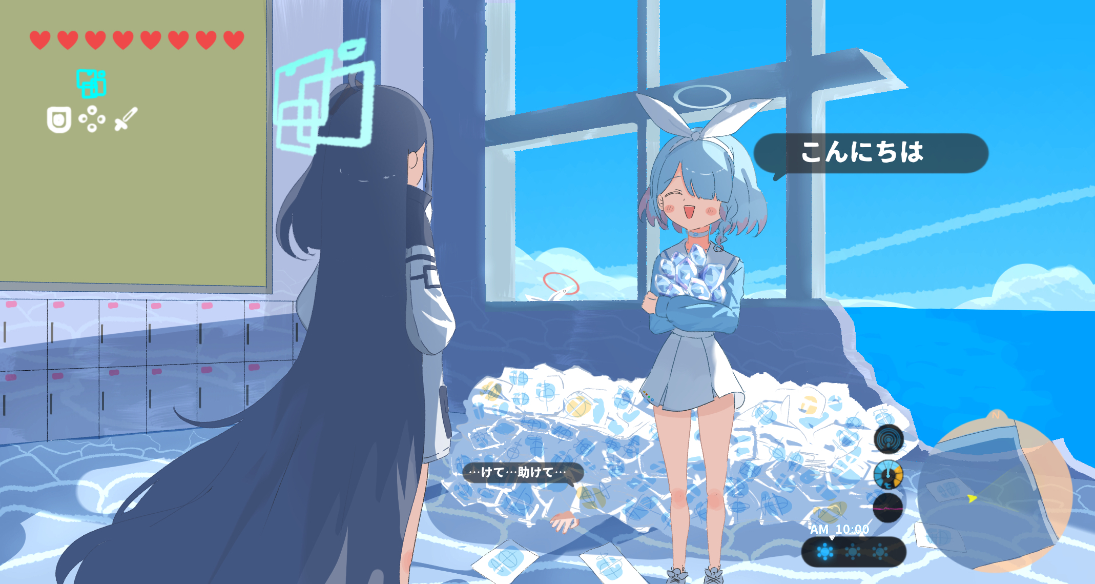 2girls 3girls absurdly_long_hair aqua_halo aris_(blue_archive) arona_(blue_archive) black_hair blue_archive blue_hair blue_shirt blue_sky blush_stickers bow_hairband braid closed_eyes commentary envelope from_behind hairband halo hiding highres holding locker long_hair looking_at_another miaki_(mi_autumn39) multicolored_hair multiple_girls nintendo ocean open_mouth parody pink_hair plana_(blue_archive) pyroxene_(blue_archive) red_halo shirt single_braid skirt sky standing the_legend_of_zelda the_legend_of_zelda:_breath_of_the_wild translation_request very_long_hair white_hairband white_skirt