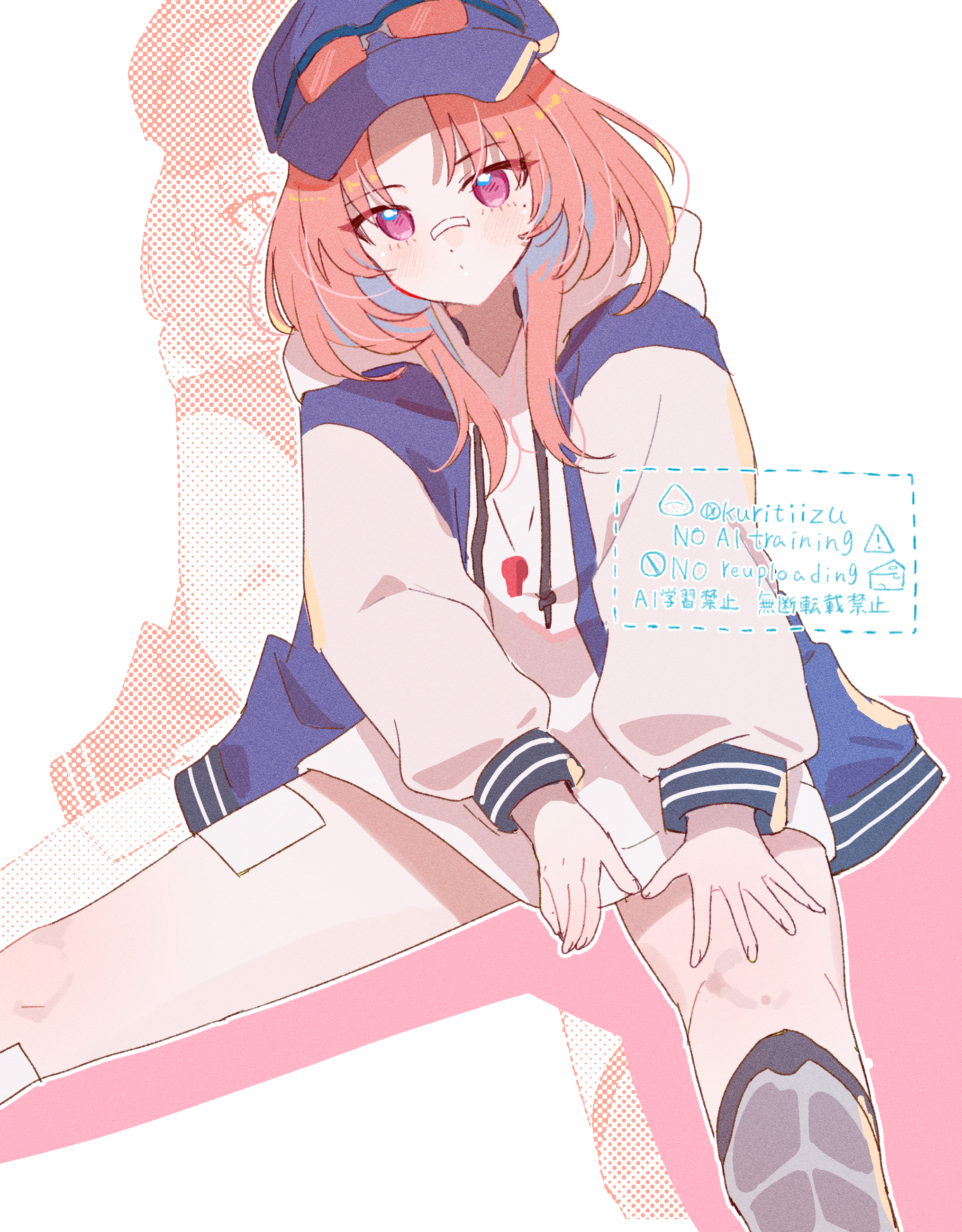 1girl absurdres artist_name bandaid bandaid_on_face bandaid_on_nose baseball_cap blue_archive blue_hat blush closed_mouth commentary drop_shadow eyes_visible_through_hair eyewear_on_headwear feet_out_of_frame gauze_on_thigh hat highres hood hood_down hoodie kuritiizu long_hair long_sleeves looking_at_viewer orange-tinted_eyewear orange_hair outline outstretched_legs pink_eyes puffy_long_sleeves puffy_sleeves rei_(blue_archive) shadow sidelocks simple_background sitting solo sports_sunglasses stretching sunglasses tinted_eyewear whistle whistle_around_neck white_background white_hoodie white_outline